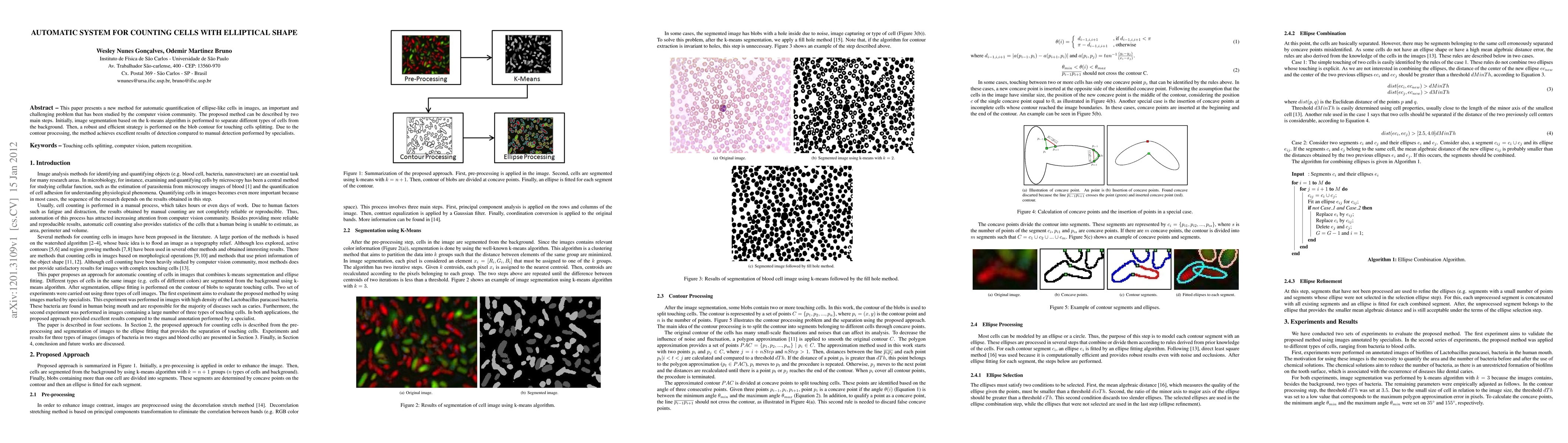 This paper presents a new method for automatic quantification of ellipse-like cells in images, an important and challenging problem that has been studied by the computer vision community. The proposed method can be described by two main steps. Initially, image segmentation based on the k-means algorithm is performed to separate different types of cells from the background. Then, a robust and efficient strategy is performed on the blob contour for touching cells splitting. Due to the contour processing, the method achieves excellent results of detection compared to manual detection performed by specialists.