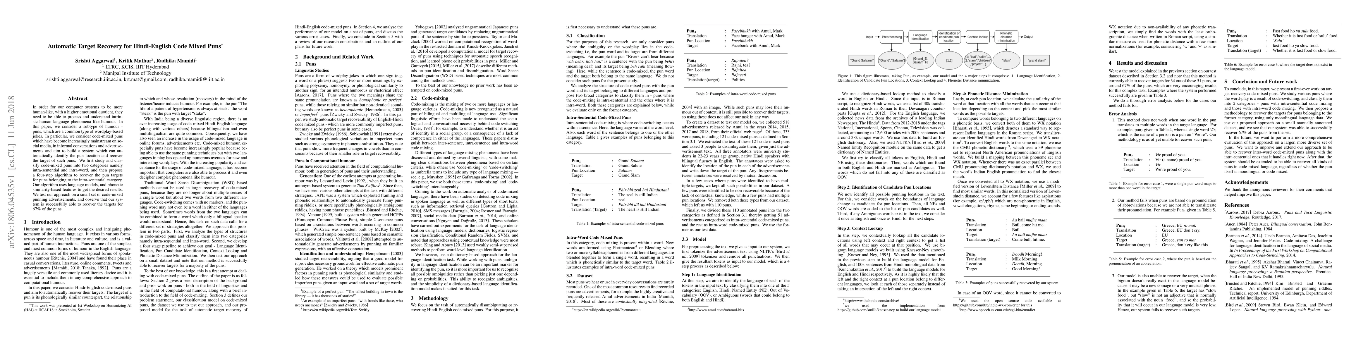 This paper develops a system to automatically identify and recover targets in Hindi-English code-mixed puns, a form of wordplay common in social media. The authors propose a four-step algorithm utilizing language models and phonetic features, achieving 67% success in pun target recovery for intra-sentential puns.