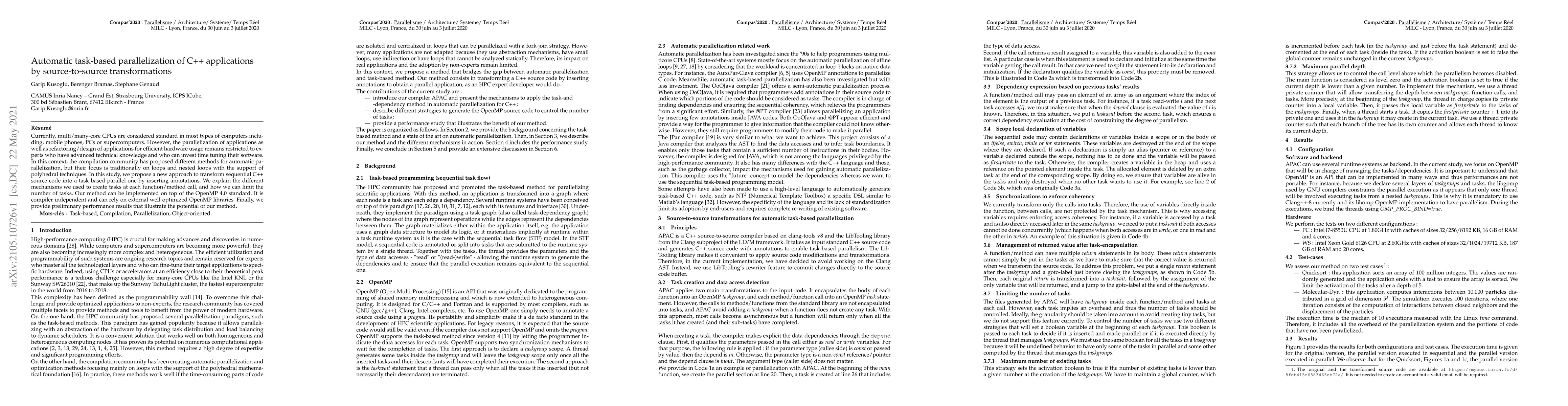 This paper proposes a source-to-source transformation method to automatically convert sequential C++ applications into task-based parallel code using annotations. The method creates tasks at function/method calls and is designed to be compiler-independent, leveraging OpenMP 4.0 and optimized libraries, with preliminary results indicating its potential for efficient parallelization.