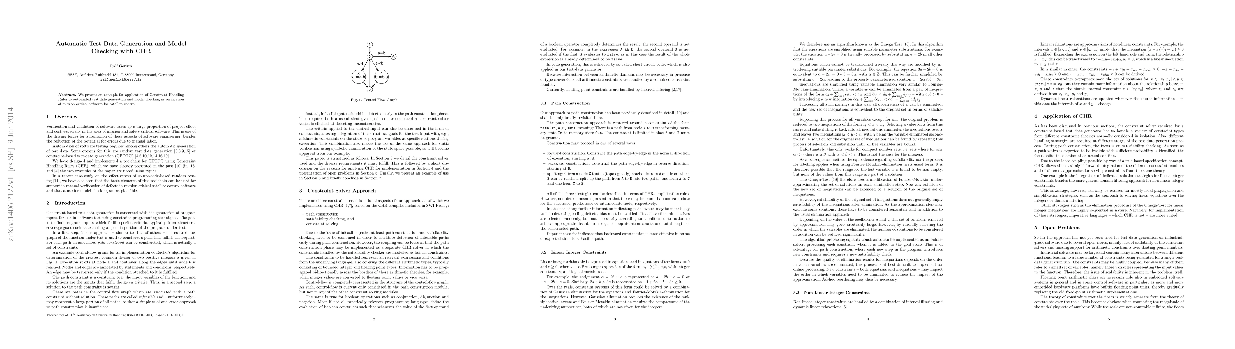 The paper presents an application of Constraint Handling Rules (CHR) for automated test data generation and model checking in the verification of mission-critical software for satellite control, utilizing path construction strategies and handling various constraint types including linear and non-linear integer constraints.