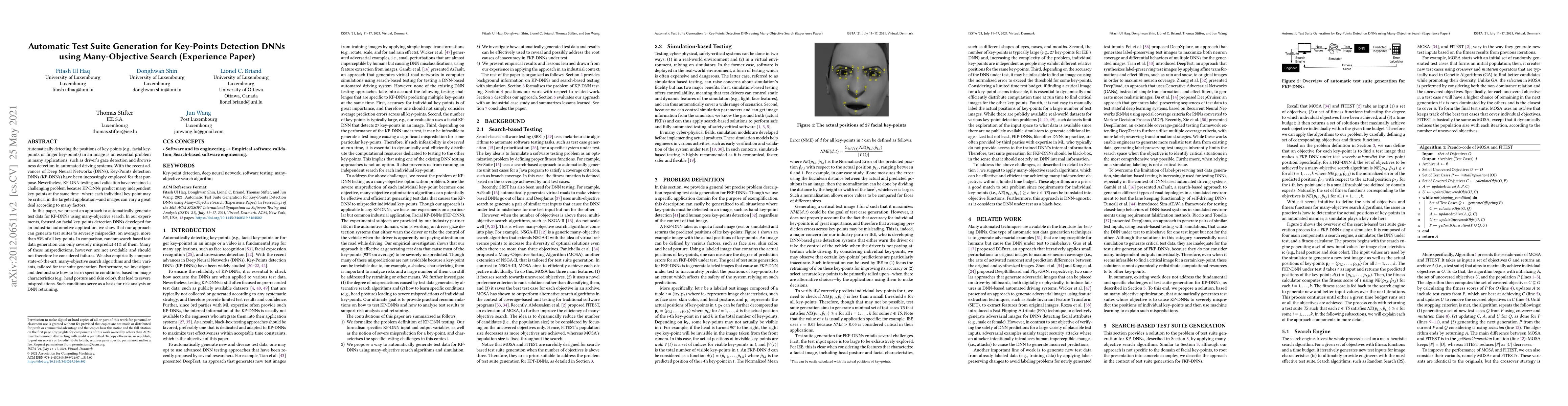 This paper proposes an automatic test suite generation method for Key-Points Detection Deep Neural Networks (KP-DNNs) using many-objective search, demonstrating its effectiveness in generating test cases that severely mispredict over 93% of key-points compared to 41% by random search. The approach also identifies specific image conditions leading to mispredictions for risk analysis or retraining.