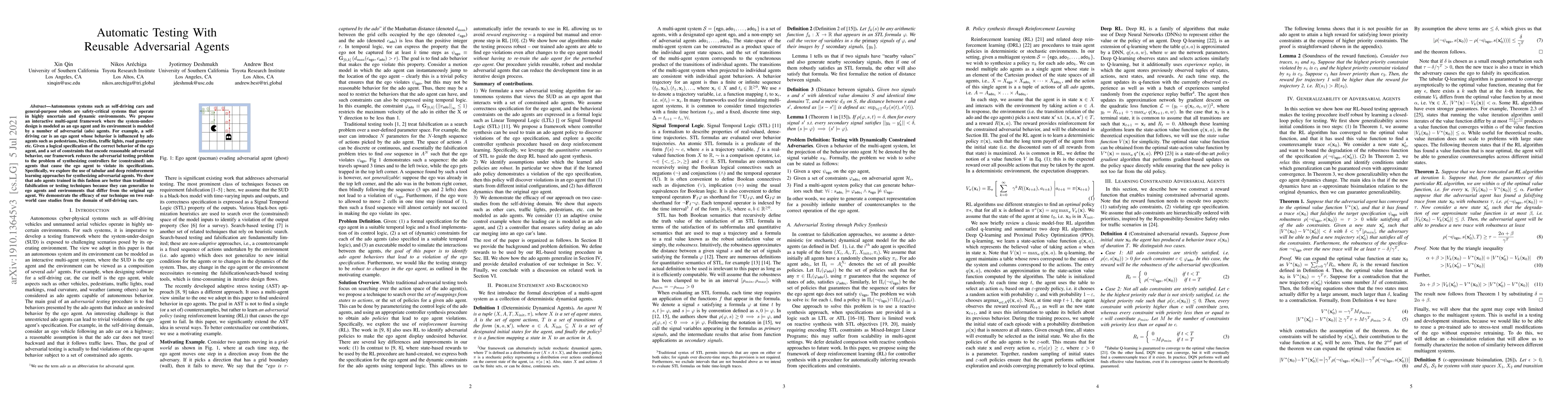 Autonomous systems such as self-driving cars and general-purpose robots are safety-critical systems that operate in highly uncertain and dynamic environments. We propose an interactive multi-agent framework where the system-under-design is modeled as an ego agent and its environment is modeled by a number of adversarial (ado) agents. For example, a self-driving car is an ego agent whose behavior is influenced by ado agents such as pedestrians, bicyclists, traffic lights, road geometry etc. Given a logical specification of the correct behavior of the ego agent, and a set of constraints that encode reasonable adversarial behavior, our framework reduces the adversarial testing problem to the problem of synthesizing controllers for (constrained) ado agents that cause the ego agent to violate its specifications. Specifically, we explore the use of tabular and deep reinforcement learning approaches for synthesizing adversarial agents. We show that ado agents trained in this fashion are better than traditional falsification or testing techniques because they can generalize to ego agents and environments that differ from the original ego agent. We demonstrate the efficacy of our technique on two real-world case studies from the domain of self-driving cars.