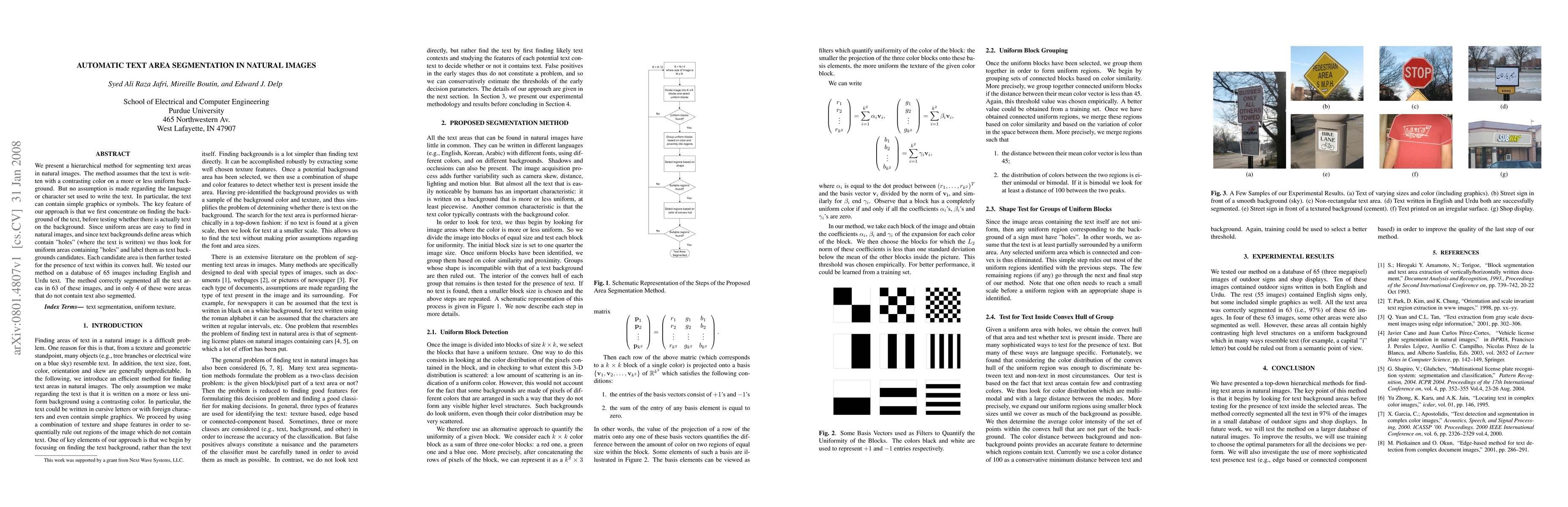 This paper introduces a hierarchical method for segmenting text areas in natural images, focusing on identifying contrasting backgrounds with "holes" indicative of text. The method successfully segmented text in 63 out of 65 tested images, with minimal false positives.