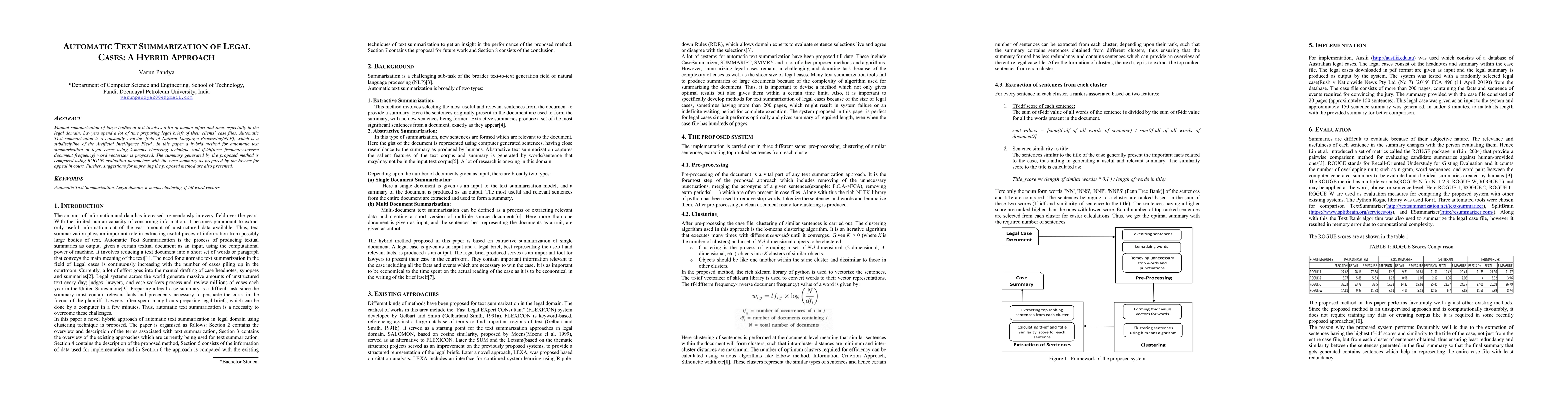 This paper proposes a hybrid approach for automatic text summarization of legal cases, utilizing k-means clustering and tf-idf vectorization. It evaluates the generated summaries against human-prepared case summaries using ROUGE metrics and suggests avenues for improvement.