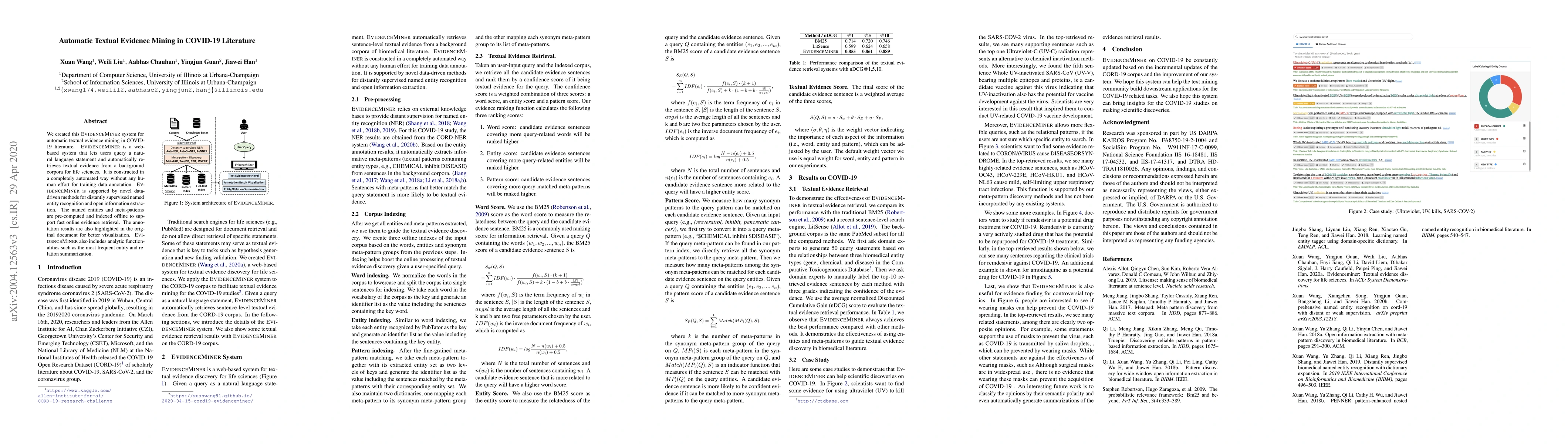 EVIDENCEMINER is an automated system for mining textual evidence from COVID-19 literature, utilizing novel data-driven methods for named entity recognition and open information extraction.