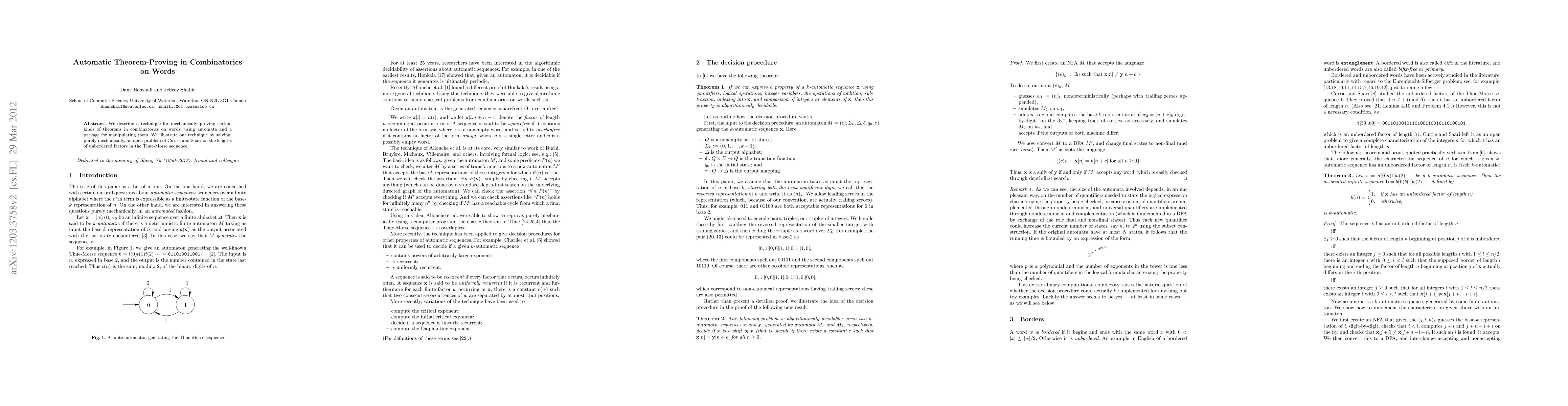This paper introduces an automated method for proving theorems in combinatorics on words, utilizing automata manipulation. The technique successfully solves an open problem regarding the lengths of unbordered factors in the Thue-Morse sequence.