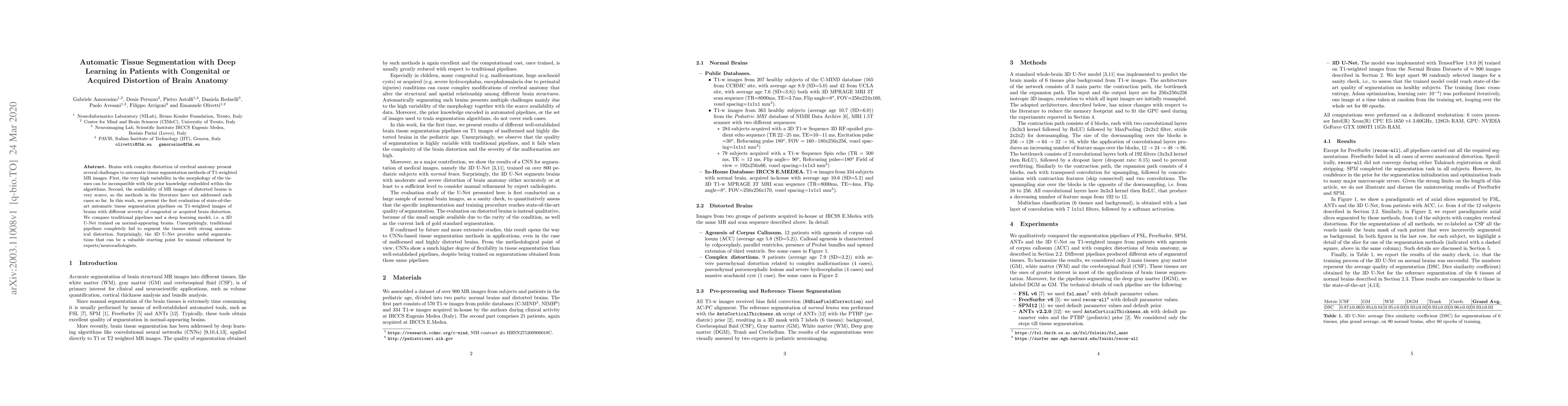 This research evaluates the performance of automatic tissue segmentation methods on T1-weighted MR images of brains with congenital or acquired distortion. Traditional pipelines fail in such cases, while a 3D U-Net deep learning model provides useful segmentations, serving as a valuable starting point for expert refinement.