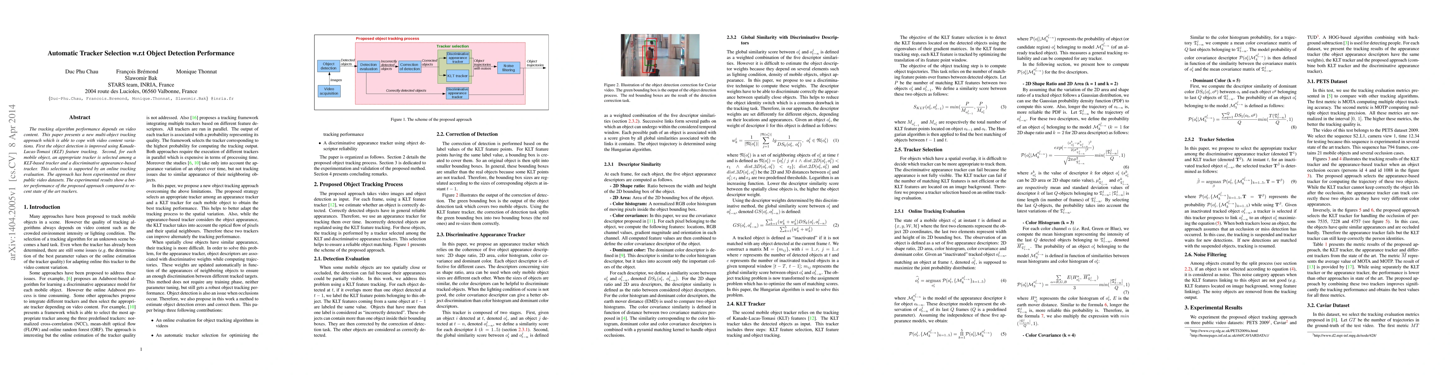 The tracking algorithm performance depends on video content. This paper presents a new multi-object tracking approach which is able to cope with video content variations. First the object detection is improved using Kanade- Lucas-Tomasi (KLT) feature tracking. Second, for each mobile object, an appropriate tracker is selected among a KLT-based tracker and a discriminative appearance-based tracker. This selection is supported by an online tracking evaluation. The approach has been experimented on three public video datasets. The experimental results show a better performance of the proposed approach compared to recent state of the art trackers.