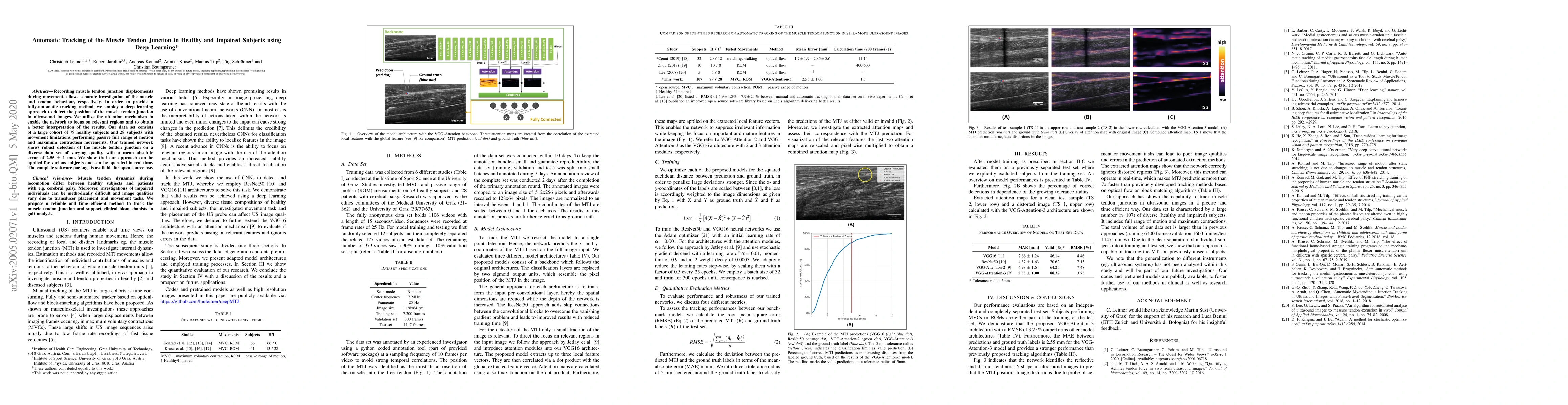 This paper presents a deep learning method for automatically tracking the muscle tendon junction in ultrasound images, employing an attention mechanism for improved accuracy. The approach is validated on a dataset of 79 healthy and 28 impaired subjects, demonstrating robust detection with a mean absolute error of 2.55±1 mm and real-time applicability.