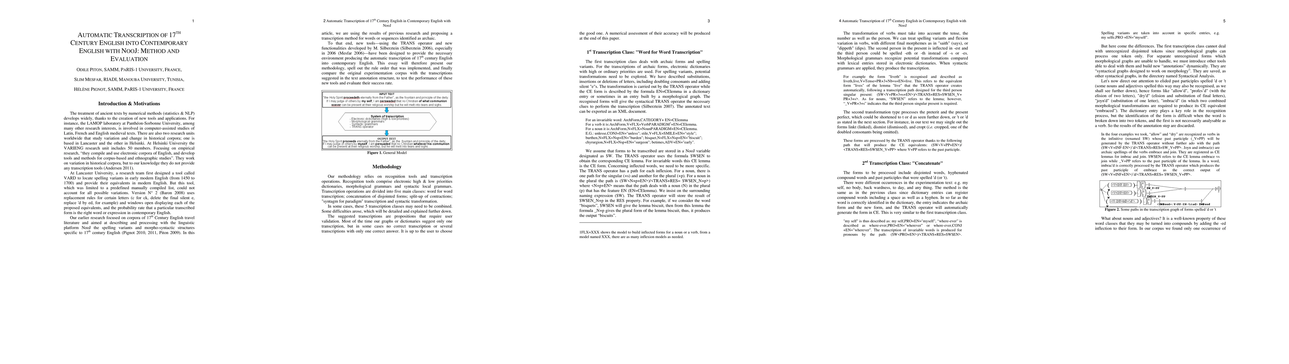 This research paper presents a method for automatically transcribing 17th century English into contemporary English using NooJ, a linguistic platform. It builds on previous work to provide a way to create a global tool for automatic transcription of archaic words and phrases.