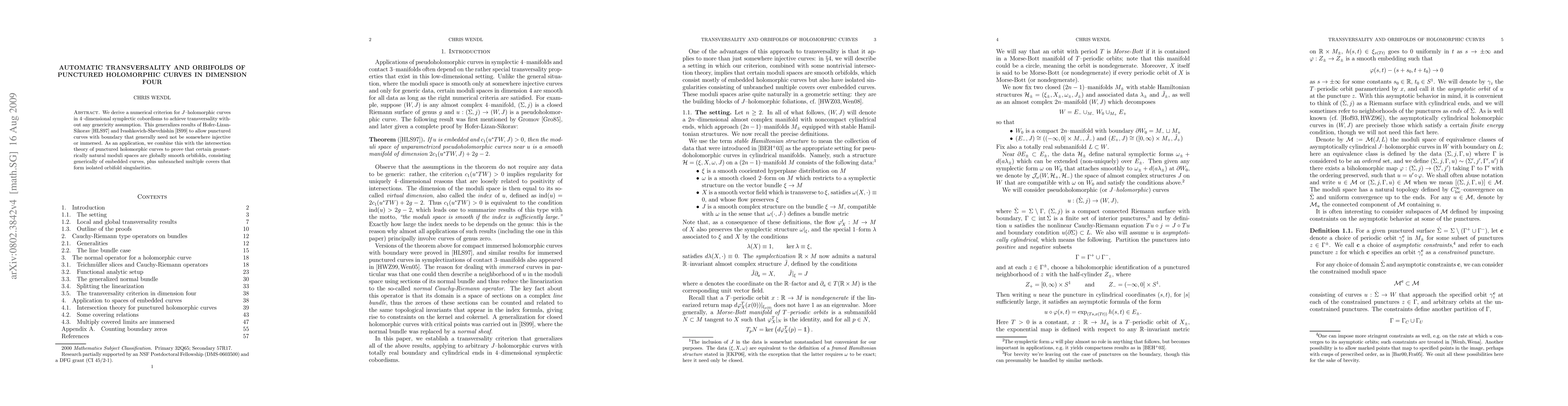 This paper presents a numerical criterion for transversality of J-holomorphic curves in 4-dimensional symplectic cobordisms without genericity assumptions, extending previous results to punctured curves. It also proves that certain moduli spaces of such curves are smooth orbifolds with embedded curves and isolated singularities.