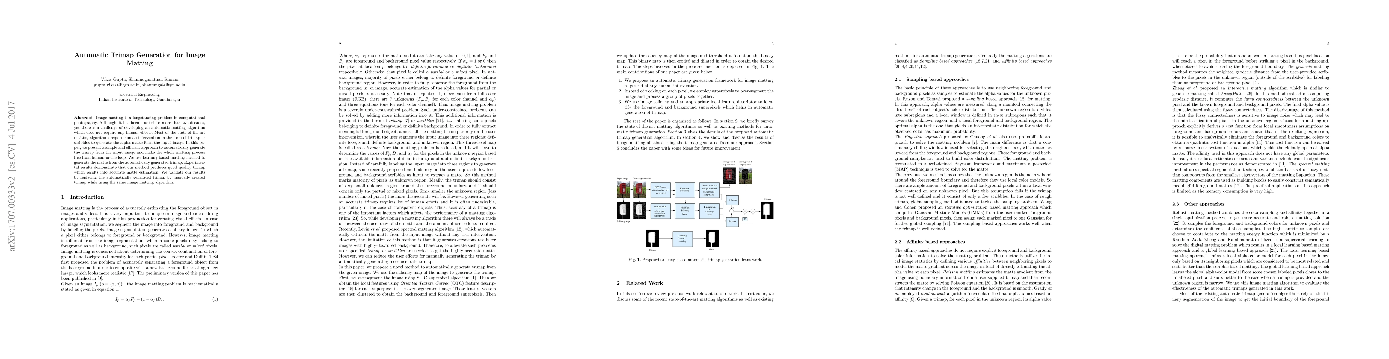 This paper proposes an automatic trimap generation method to eliminate human intervention in image matting, using a learning-based approach to generate trimaps from input images. Experimental results show that the automatically generated trimaps lead to accurate matte estimation, comparable to manually created trimaps.