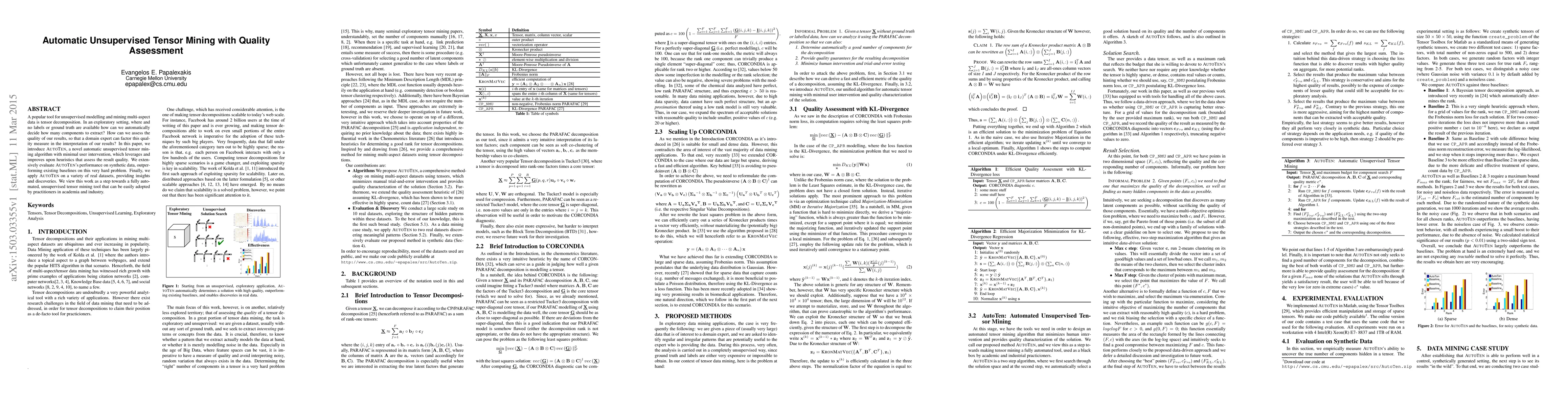 A popular tool for unsupervised modelling and mining multi-aspect data is tensor decomposition. In an exploratory setting, where and no labels or ground truth are available how can we automatically decide how many components to extract? How can we assess the quality of our results, so that a domain expert can factor this quality measure in the interpretation of our results? In this paper, we introduce AutoTen, a novel automatic unsupervised tensor mining algorithm with minimal user intervention, which leverages and improves upon heuristics that assess the result quality. We extensively evaluate AutoTen's performance on synthetic data, outperforming existing baselines on this very hard problem. Finally, we apply AutoTen on a variety of real datasets, providing insights and discoveries. We view this work as a step towards a fully automated, unsupervised tensor mining tool that can be easily adopted by practitioners in academia and industry.