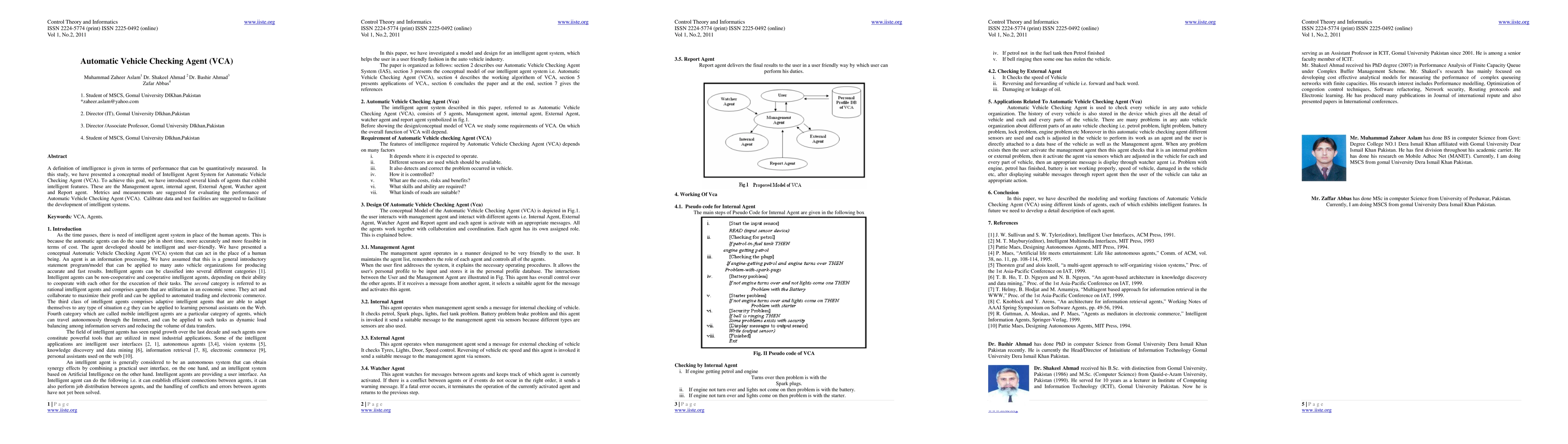 Researchers presented a conceptual model for an Automatic Vehicle Checking Agent (VCA) using five types of agents to measure performance. Key findings suggest the use of calibrate data and test facilities to develop intelligent systems.
