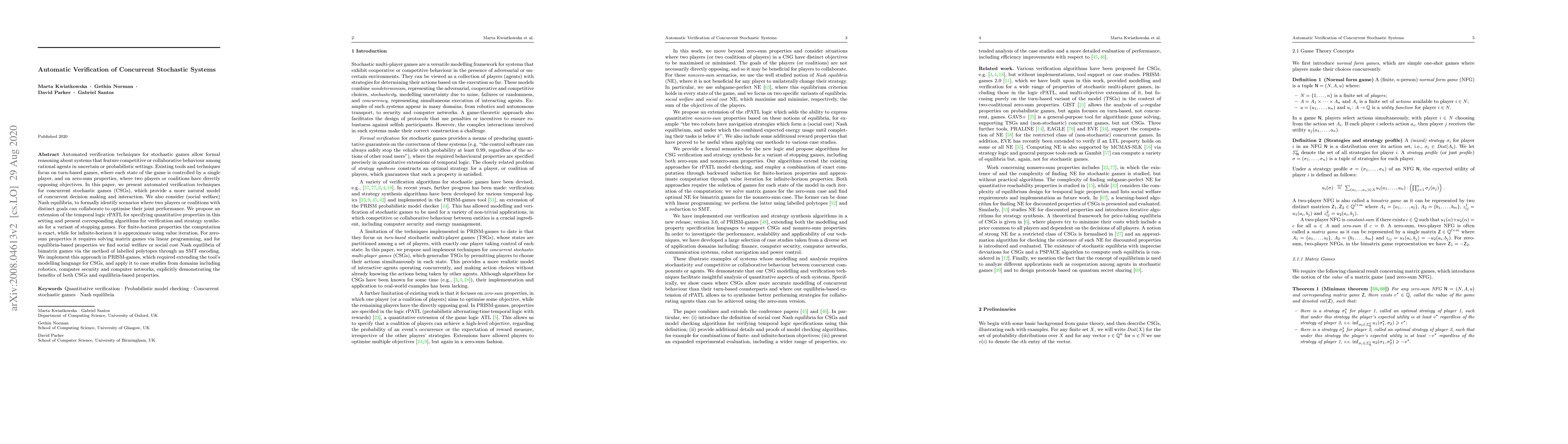 This paper introduces automated verification techniques for concurrent stochastic games (CSGs), extending temporal logic rPATL for quantitative properties and employing algorithms for exact and approximate computations. It also explores Nash equilibria for collaborative optimization, implemented in PRISM-games and demonstrated across robotics, computer security, and networks.