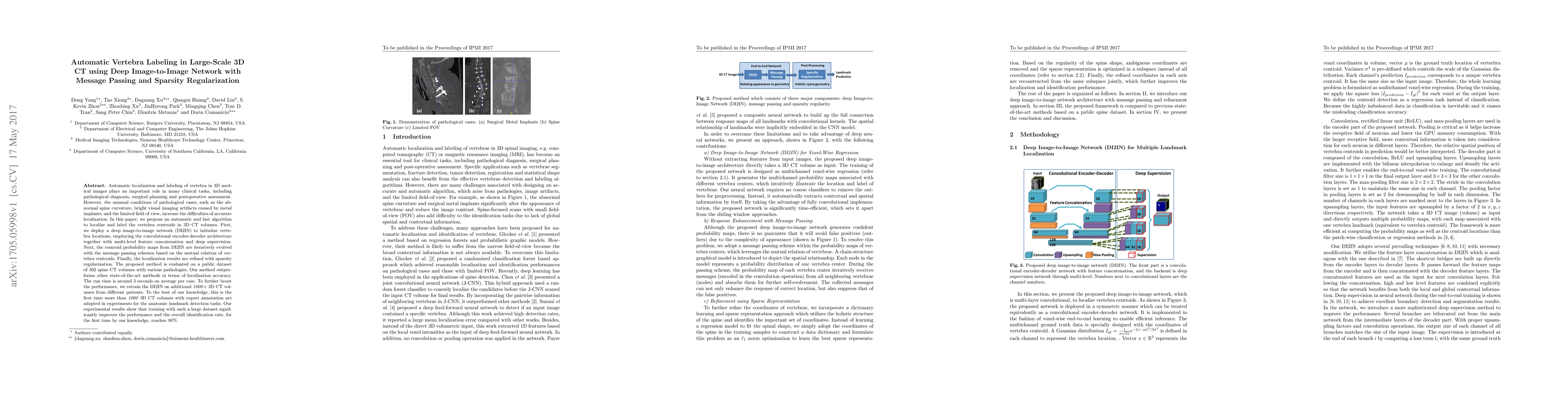 This paper proposes a deep image-to-image network with message passing and sparsity regularization for automatic vertebra labeling in large-scale 3D CT scans. The method achieves high localization accuracy and outperforms other state-of-the-art techniques, with an identification rate of 90% after training on over 1000 additional CT volumes.