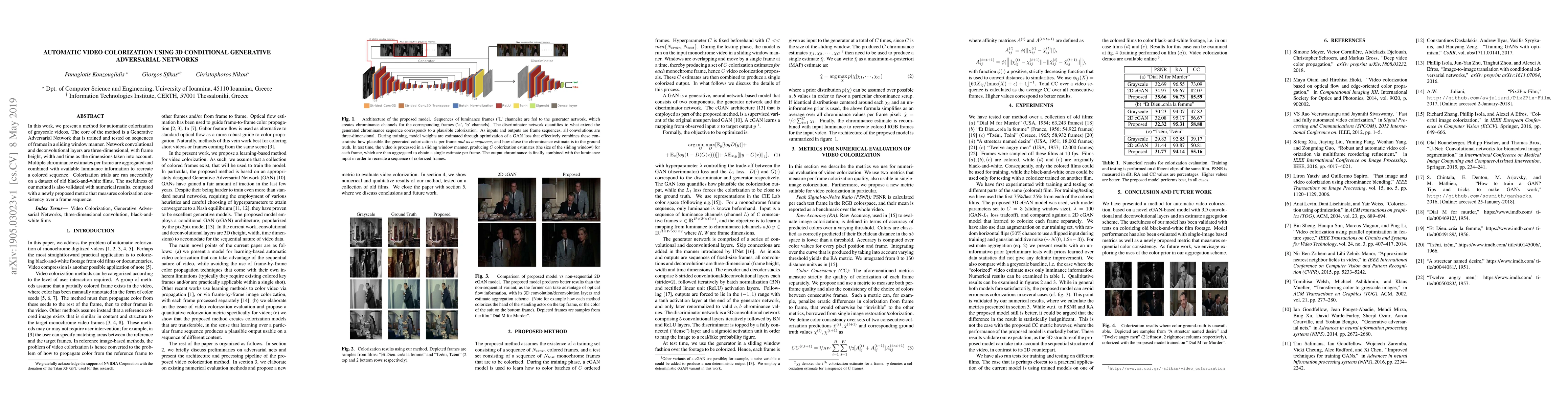 This paper introduces a 3D conditional Generative Adversarial Network for automatic colorization of grayscale video sequences, utilizing convolutional and deconvolutional layers that consider frame height, width, and time. The method successfully colorizes old black-and-white films, validated by a new metric measuring colorization consistency over sequences.