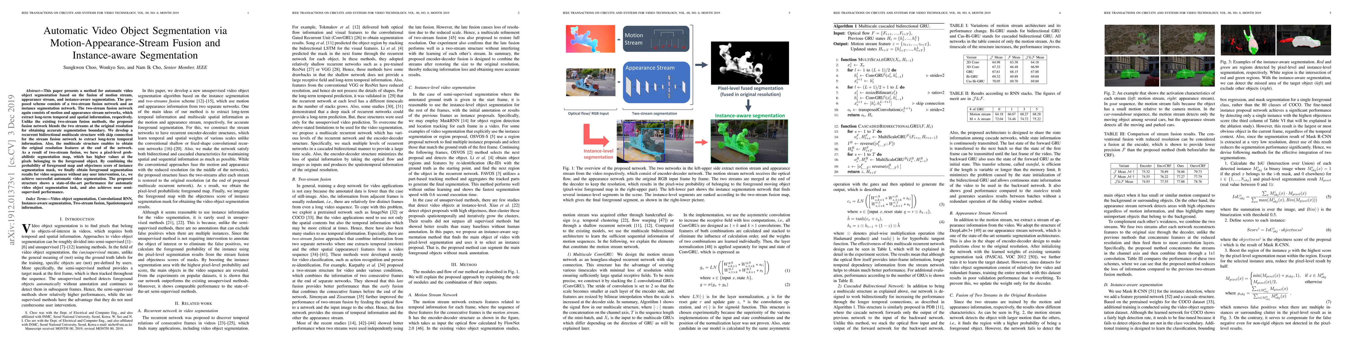 This paper introduces a method for automatic video object segmentation by fusing motion and appearance streams with instance-aware segmentation, achieving state-of-the-art performance through a two-stream fusion network that retains original resolution features for precise segmentation boundaries. The method successfully segments objects in video sequences without user intervention.