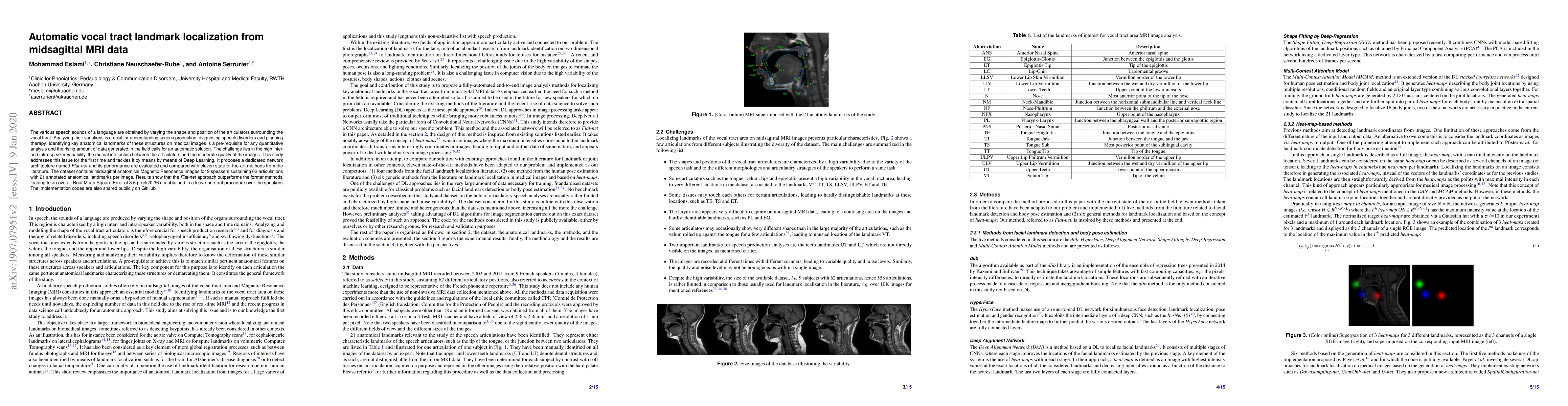 This paper introduces a Deep Learning-based method called Flat-net for automatic localization of vocal tract landmarks in midsagittal MRI data. The proposed method outperforms eleven state-of-the-art techniques, achieving a Root Mean Square Error of 3.6 pixels/0.36 cm, and is made publicly available on GitHub.
