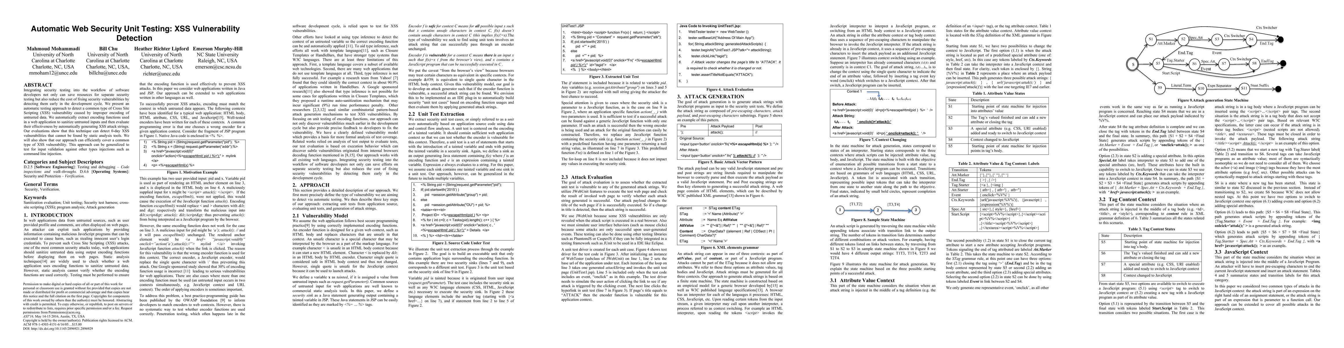 This paper proposes an automated testing method for detecting Cross Site Scripting (XSS) vulnerabilities by evaluating the effectiveness of encoding functions in web applications. The approach can identify 0-day XSS vulnerabilities missed by static analysis tools and can be extended to test for other types of injection attacks.