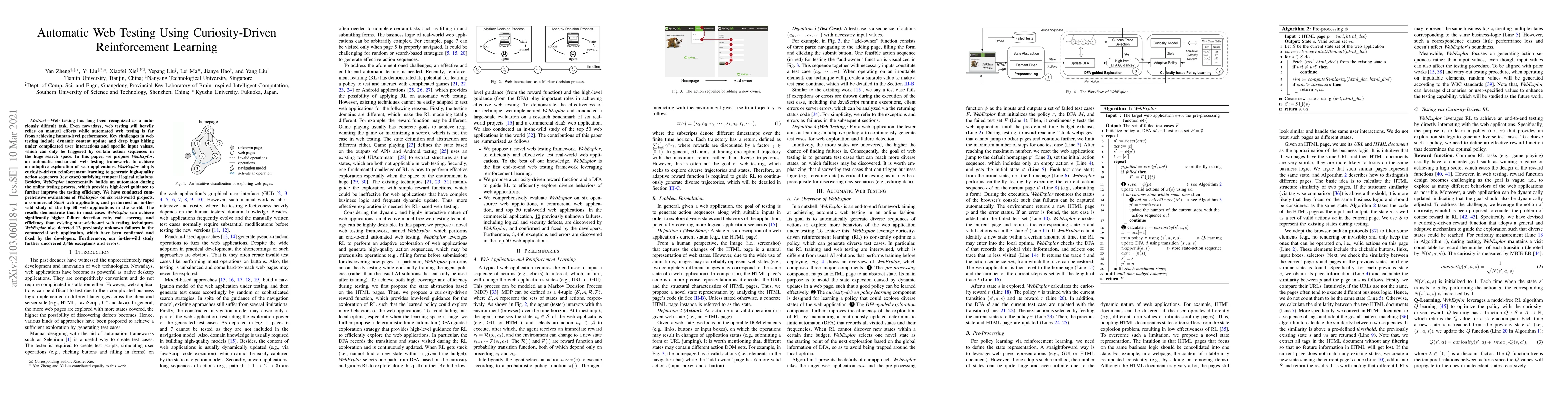 This paper introduces WebExplor, an automatic web testing framework using curiosity-driven reinforcement learning to adaptively explore web applications. It achieves higher failure detection rates, code coverage, and efficiency compared to existing techniques, as demonstrated through evaluations on real-world projects and an in-the-wild study of top web applications.