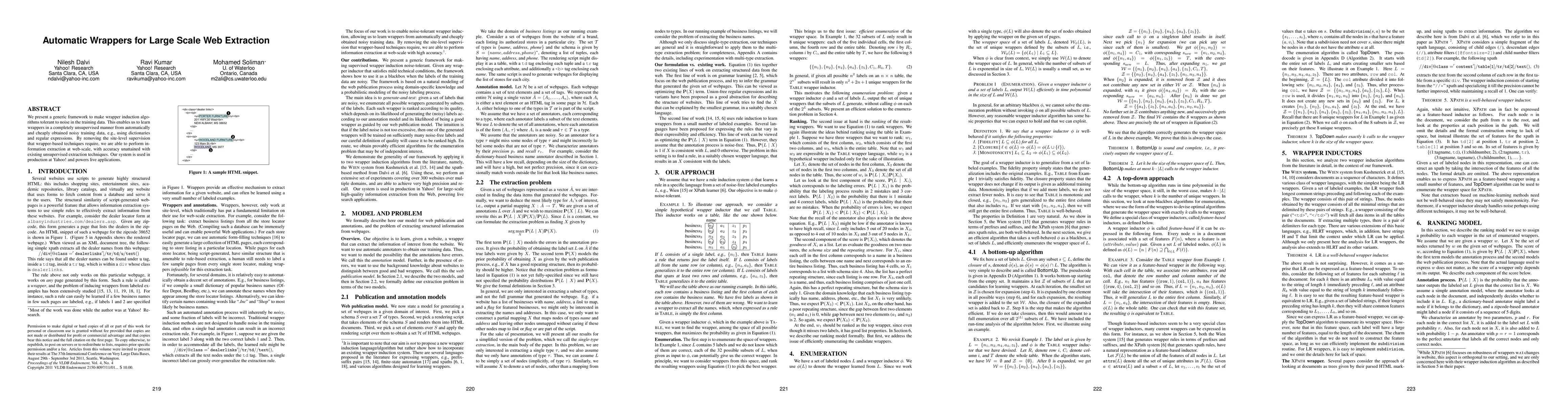 This paper introduces a framework for creating automatic wrappers that can extract data from web pages in an unsupervised manner, achieving high accuracy despite noisy training data. The system is deployed at Yahoo! and supports large-scale web information extraction.