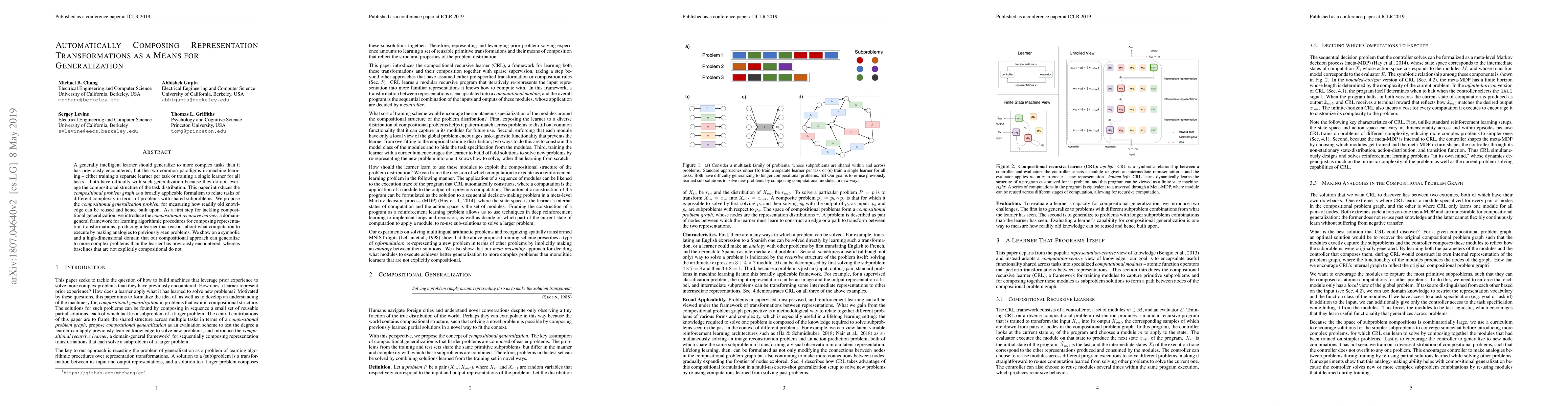 A generally intelligent learner should generalize to more complex tasks than it has previously encountered, but the two common paradigms in machine learning -- either training a separate learner per task or training a single learner for all tasks -- both have difficulty with such generalization because they do not leverage the compositional structure of the task distribution. This paper introduces the compositional problem graph as a broadly applicable formalism to relate tasks of different complexity in terms of problems with shared subproblems. We propose the compositional generalization problem for measuring how readily old knowledge can be reused and hence built upon. As a first step for tackling compositional generalization, we introduce the compositional recursive learner, a domain-general framework for learning algorithmic procedures for composing representation transformations, producing a learner that reasons about what computation to execute by making analogies to previously seen problems. We show on a symbolic and a high-dimensional domain that our compositional approach can generalize to more complex problems than the learner has previously encountered, whereas baselines that are not explicitly compositional do not.