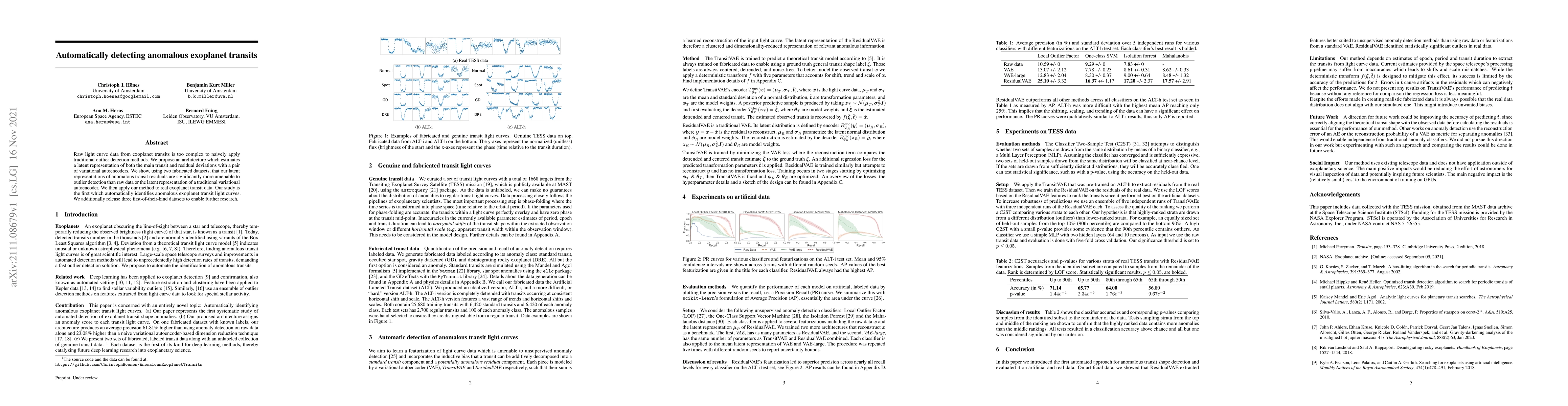 This paper proposes a novel architecture using variational autoencoders to detect anomalous exoplanet transits by estimating latent representations of transit and residual deviations. The method outperforms traditional detection methods and is applied to real data, marking the first automatic identification of such anomalies.