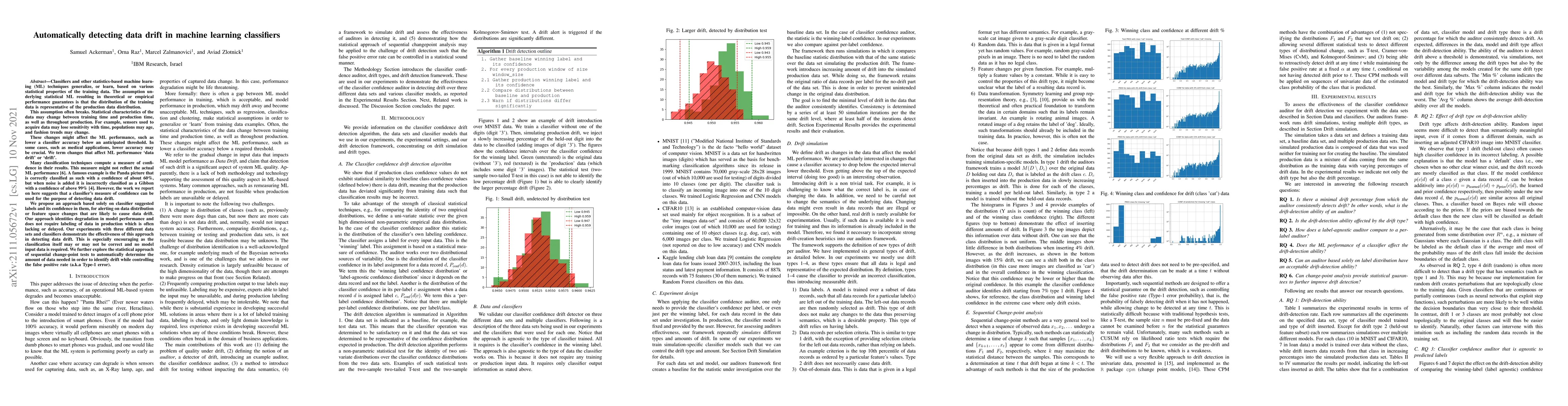 Classifiers and other statistics-based machine learning (ML) techniques generalize, or learn, based on various statistical properties of the training data. The assumption underlying statistical ML resulting in theoretical or empirical performance guarantees is that the distribution of the training data is representative of the production data distribution. This assumption often breaks; for instance, statistical distributions of the data may change. We term changes that affect ML performance `data drift' or `drift'. Many classification techniques compute a measure of confidence in their results. This measure might not reflect the actual ML performance. A famous example is the Panda picture that is correctly classified as such with a confidence of about 60\%, but when noise is added it is incorrectly classified as a Gibbon with a confidence of above 99\%. However, the work we report on here suggests that a classifier's measure of confidence can be used for the purpose of detecting data drift. We propose an approach based solely on classifier suggested labels and its confidence in them, for alerting on data distribution or feature space changes that are likely to cause data drift. Our approach identities degradation in model performance and does not require labeling of data in production which is often lacking or delayed. Our experiments with three different data sets and classifiers demonstrate the effectiveness of this approach in detecting data drift. This is especially encouraging as the classification itself may or may not be correct and no model input data is required. We further explore the statistical approach of sequential change-point tests to automatically determine the amount of data needed in order to identify drift while controlling the false positive rate (Type-1 error).