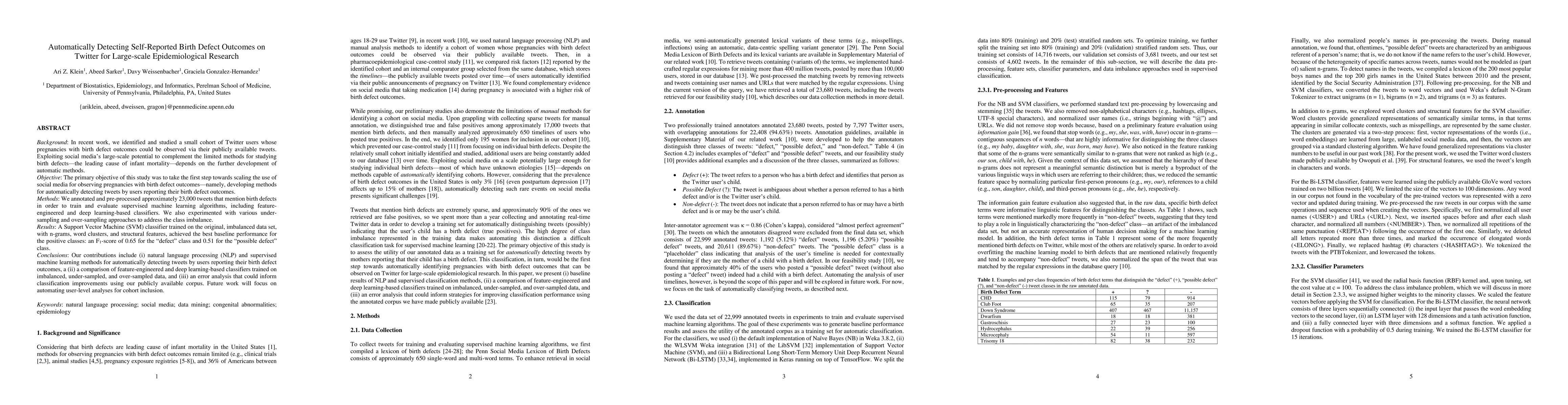 This study develops machine learning methods to automatically detect tweets reporting birth defect outcomes on Twitter, aiming to leverage social media for large-scale epidemiological research. An SVM classifier achieved the best performance, highlighting the potential of NLP and machine learning in addressing class imbalance and improving future cohort analyses.