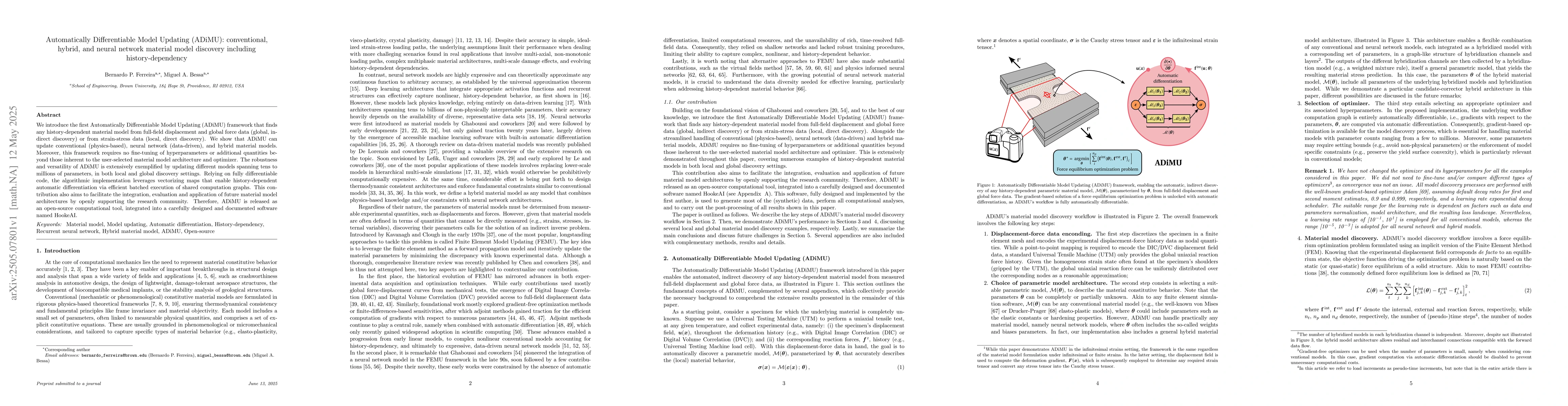 The research introduces the Automatically Differentiable Model Updating (ADiMU) framework, which finds history-dependent material models from full-field displacement and force data or strain-stress data using conventional, hybrid, and neural network models without hyperparameter tuning.