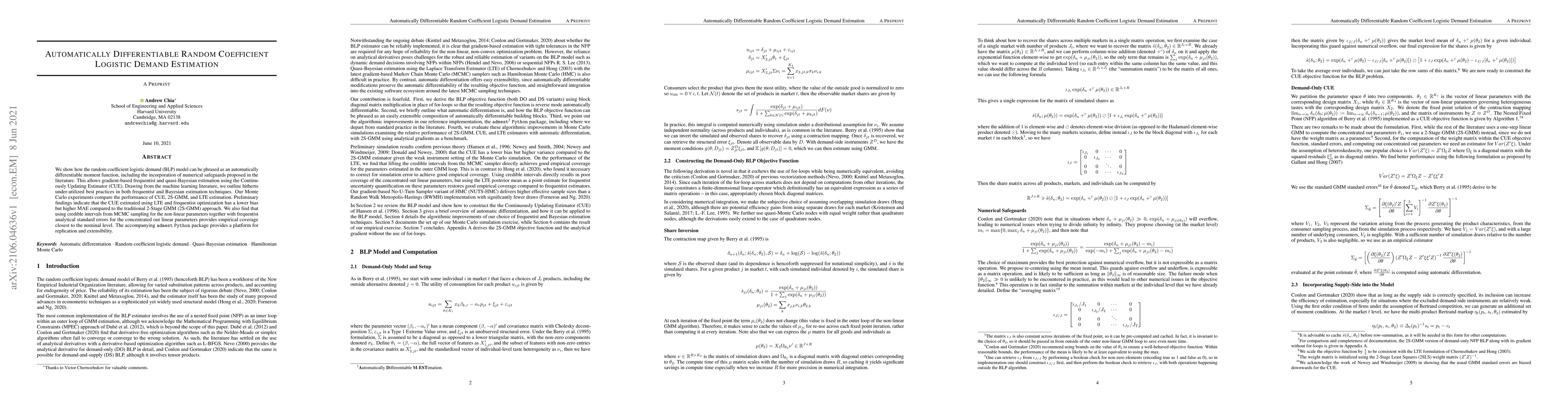 This paper presents an automatically differentiable random coefficient logistic demand model, enabling gradient-based estimation via the Continuously Updating Estimator (CUE). Comparative Monte Carlo experiments suggest CUE has lower bias but higher mean absolute error compared to 2-Stage GMM, with optimal empirical coverage achieved by combining MCMC credible intervals and frequentist standard errors.