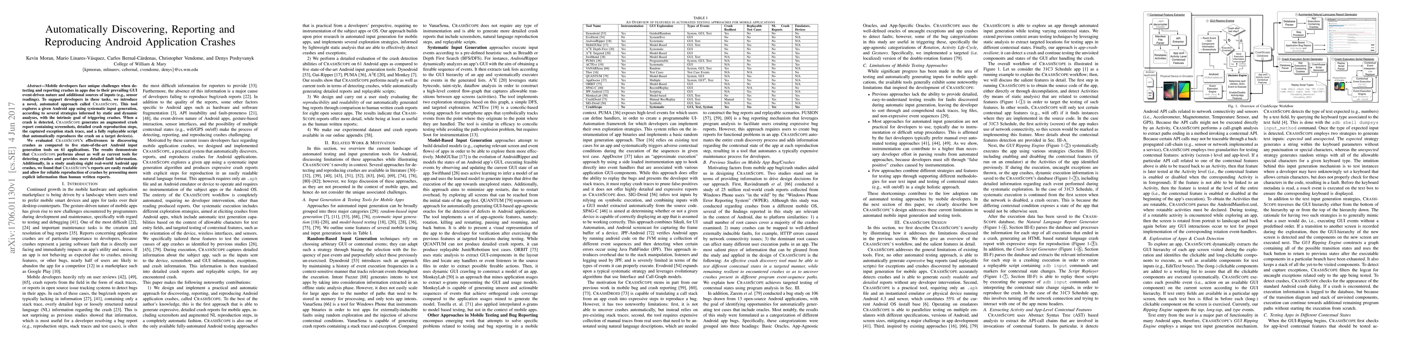 CRASHSCOPE is an automated tool for discovering and reporting Android app crashes through systematic input generation, generating detailed crash reports with reproducible steps. Evaluations show it performs competitively with existing tools and provides more explicit, human-readable crash information.