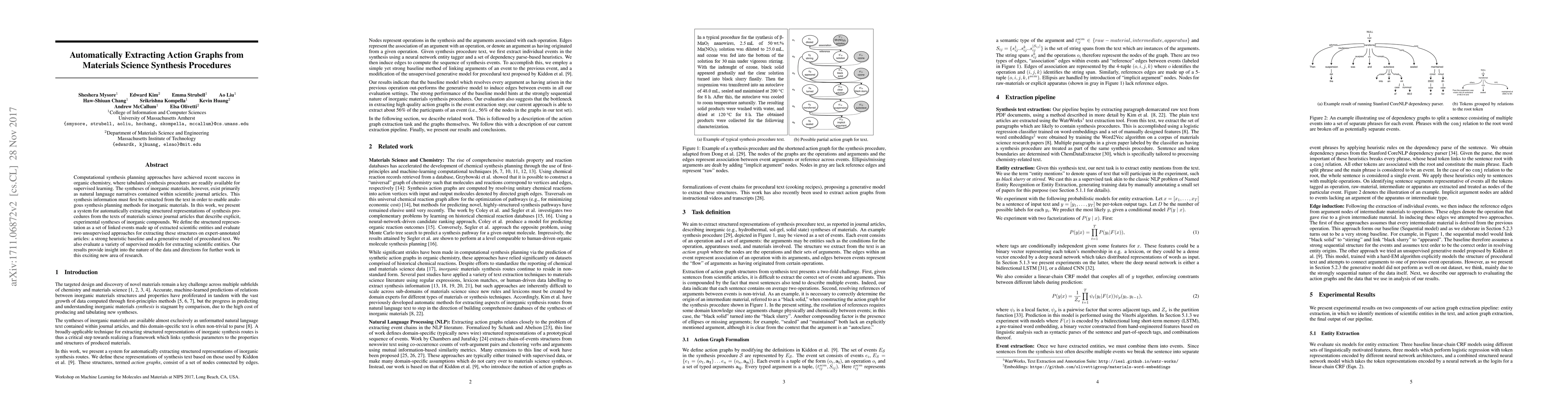 This paper introduces a system for automatically extracting structured synthesis procedures from materials science journal articles. It evaluates unsupervised methods for creating linked event representations from natural language text and supervised models for identifying scientific entities, aiming to enable synthesis planning for inorganic materials.