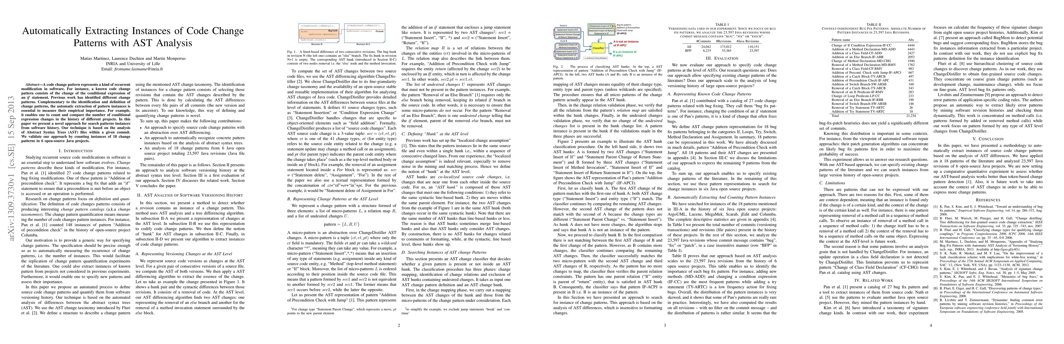 This paper introduces a method for automatically extracting instances of code change patterns using Abstract Syntax Trees (AST) analysis. The authors validate their approach by identifying 18 change patterns in the commit histories of six open-source Java projects.