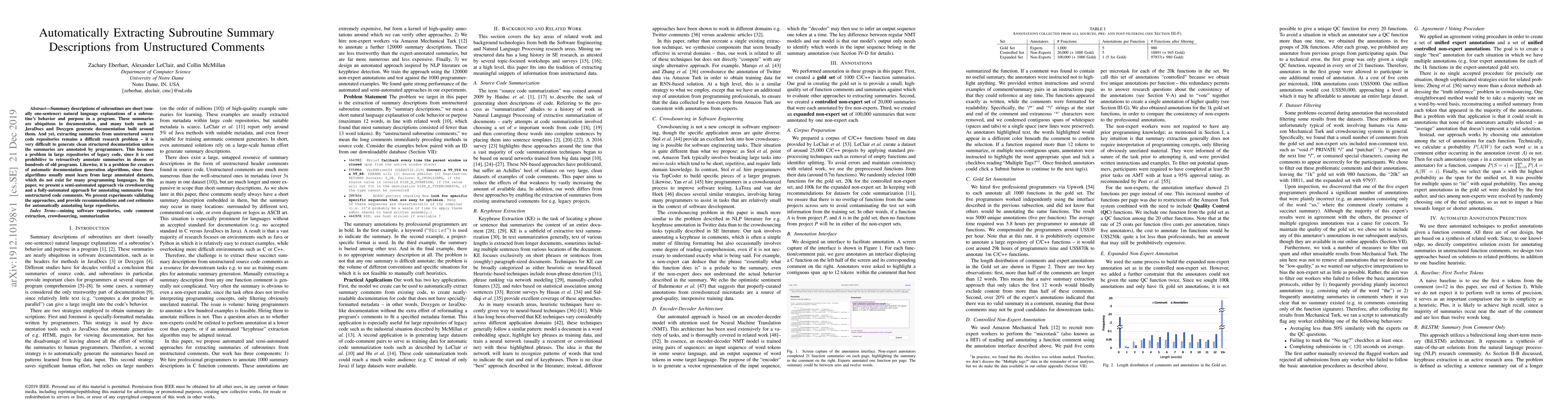 Researchers developed a semi-automated approach to annotate subroutine summaries from unstructured code comments using crowdsourcing and a fully-automated method, validating their approaches with experiments.