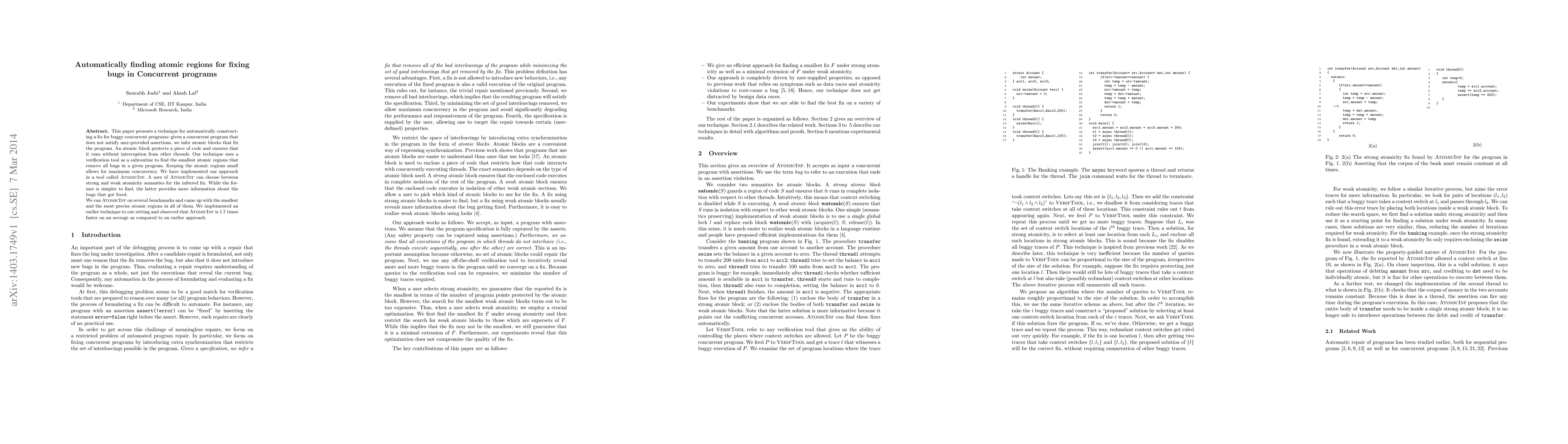 This paper introduces a method for automatically identifying and constructing atomic blocks to fix bugs in concurrent programs, using a tool called AtomicInf. The technique leverages a verification tool to find the smallest atomic regions that resolve all bugs, balancing concurrency and precision, and is shown to be faster than previous methods.
