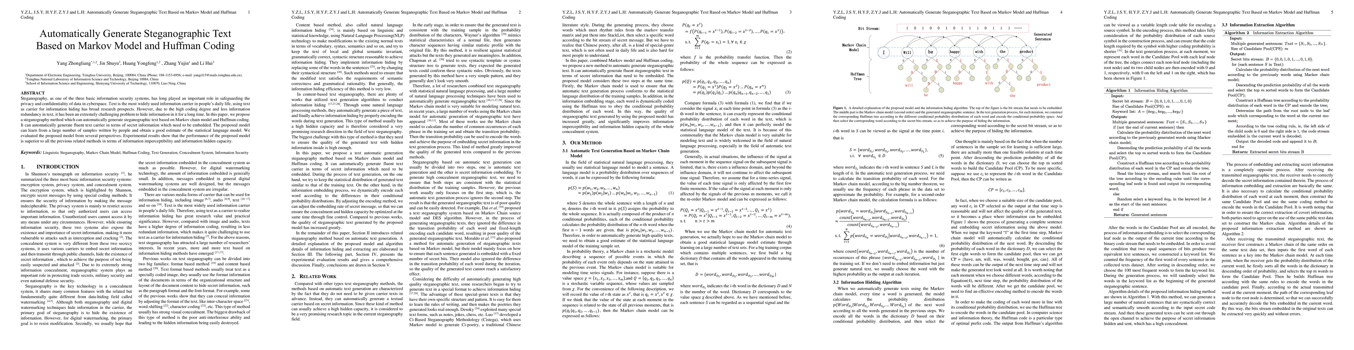 Steganography, as one of the three basic information security systems, has long played an important role in safeguarding the privacy and confidentiality of data in cyberspace. The text is the most widely used information carrier in people's daily life, using text as a carrier for information hiding has broad research prospects. However, due to the high coding degree and less information redundancy in the text, it has been an extremely challenging problem to hide information in it for a long time. In this paper, we propose a steganography method which can automatically generate steganographic text based on the Markov chain model and Huffman coding. It can automatically generate fluent text carrier in terms of secret information which need to be embedded. The proposed model can learn from a large number of samples written by people and obtain a good estimate of the statistical language model. We evaluated the proposed model from several perspectives. Experimental results show that the performance of the proposed model is superior to all the previous related methods in terms of information imperceptibility and information hidden capacity.