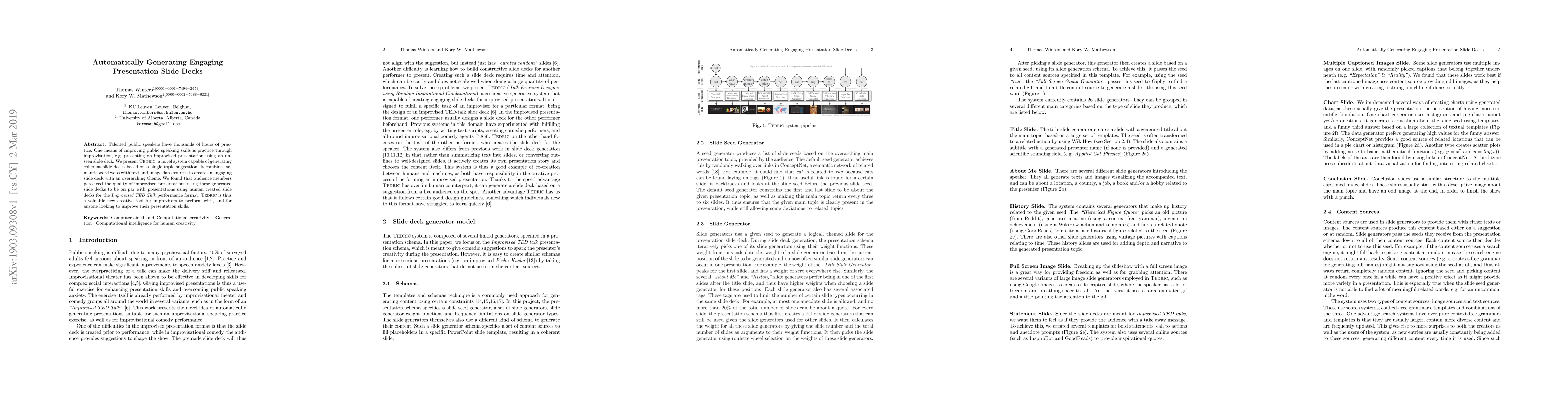 TEDRIC is a system that automatically generates engaging slide decks based on a single topic, combining semantic word webs with text and image data. Audience members rated improvised presentations using TEDRIC-generated slides as comparable to those using human-created slides, indicating its potential to aid public speaking practice.