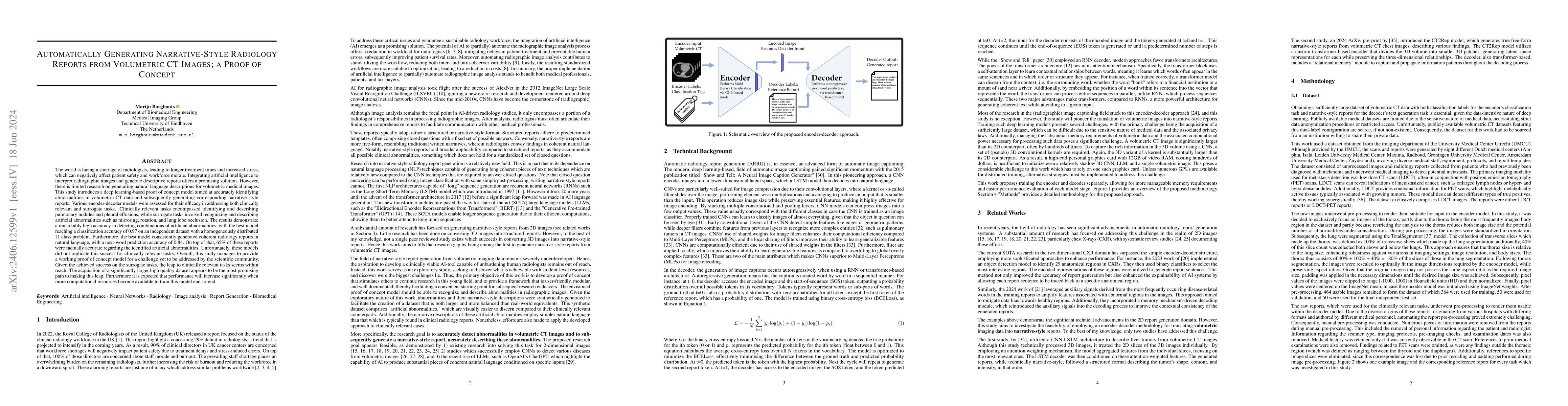 The world faces a shortage of radiologists, leading to longer treatment times and increased stress, negatively impacting patient safety and workforce morale. Integrating artificial intelligence to interpret radiographic images and generate descriptive reports offers a promising solution. However, limited research exists on generating natural language descriptions for volumetric medical images. This study introduces a deep learning-based proof of concept model to accurately identify abnormalities in volumetric CT data and generate narrative-style reports. Various encoder-decoder models were assessed for their efficacy in clinically relevant and surrogate tasks. Clinically relevant tasks involved identifying and describing pulmonary nodules and pleural effusions, while surrogate tasks involved recognizing and describing artificial abnormalities such as mirroring, rotation, and lung lobe occlusion. The results show high accuracy in detecting combinations of artificial abnormalities, with the best model achieving a classification accuracy of 0.97 on an independent dataset with a homogeneously distributed 11-class problem. Furthermore, the best model consistently generated coherent radiology reports in natural language, with a next-word prediction accuracy of 0.84. Additionally, 65% of these reports were factually accurate regarding the identified artificial abnormalities. Unfortunately, these models did not replicate this success for clinically relevant tasks. Overall, this study provides a working proof of concept model for a challenge yet to be fully addressed by the scientific community. Given the success on surrogate tasks, the leap to clinically relevant tasks seems feasible. Acquiring a significantly larger high-quality dataset appears to be the most promising path forward, alongside more computational resources for end-to-end model training.