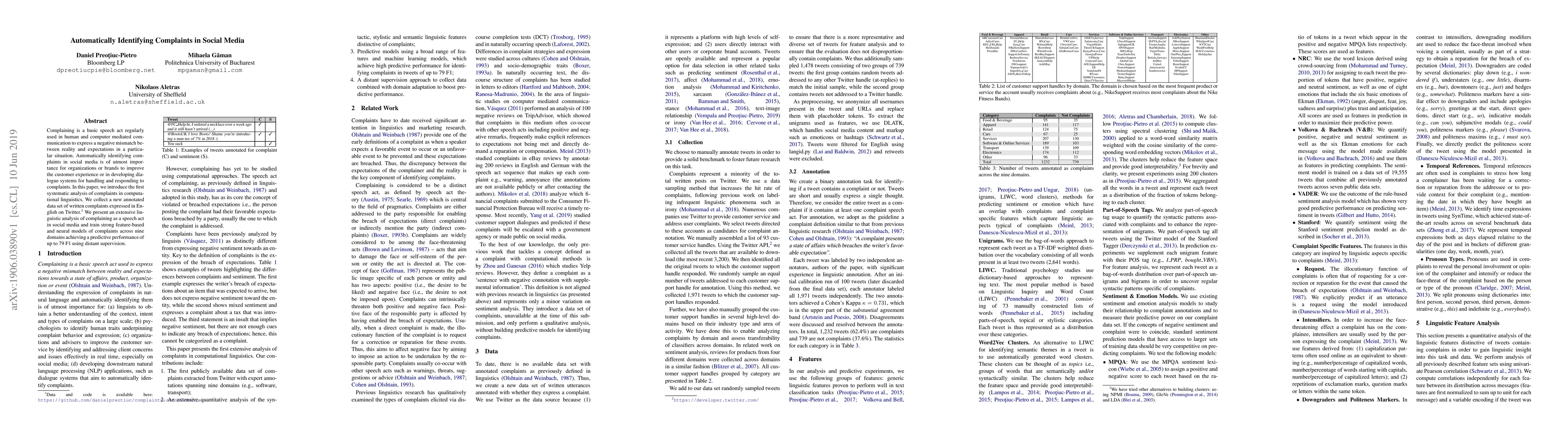 This paper systematically analyzes complaints in computational linguistics, introducing a new annotated dataset of English complaints from Twitter. It trains feature-based and neural models to identify complaints, achieving up to 79 F1 score, and provides an extensive linguistic analysis of complaining as a speech act in social media.
