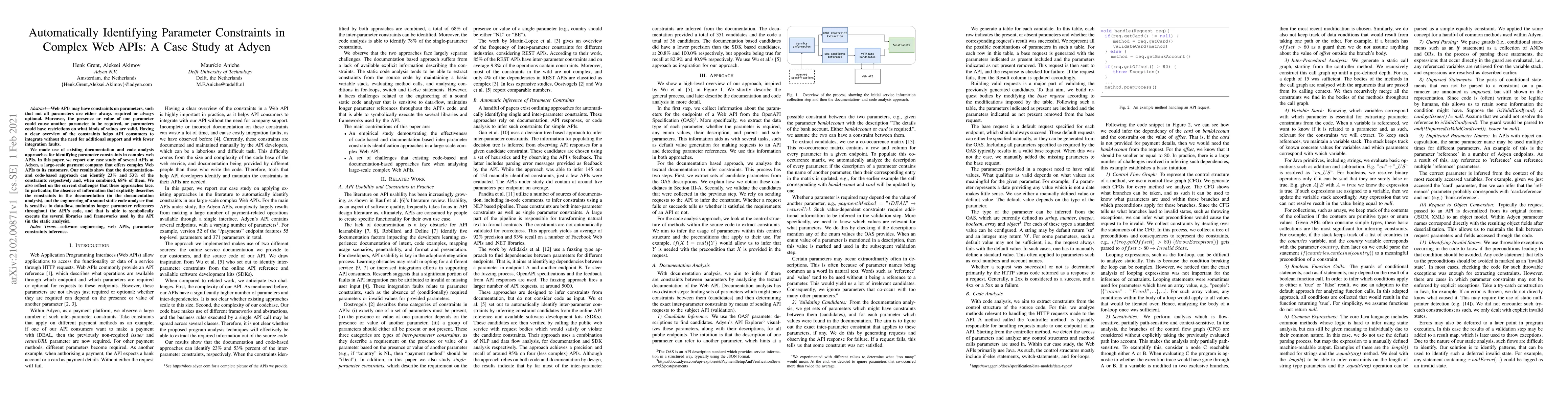 This paper explores methods for automatically identifying parameter constraints in complex web APIs using documentation and code analysis, focusing on APIs at Adyen. The study found that documentation and code analysis together identified 68% of the constraints, highlighting challenges in both approaches, particularly the lack of explicit constraint information in documentation and the complexity of static code analysis.