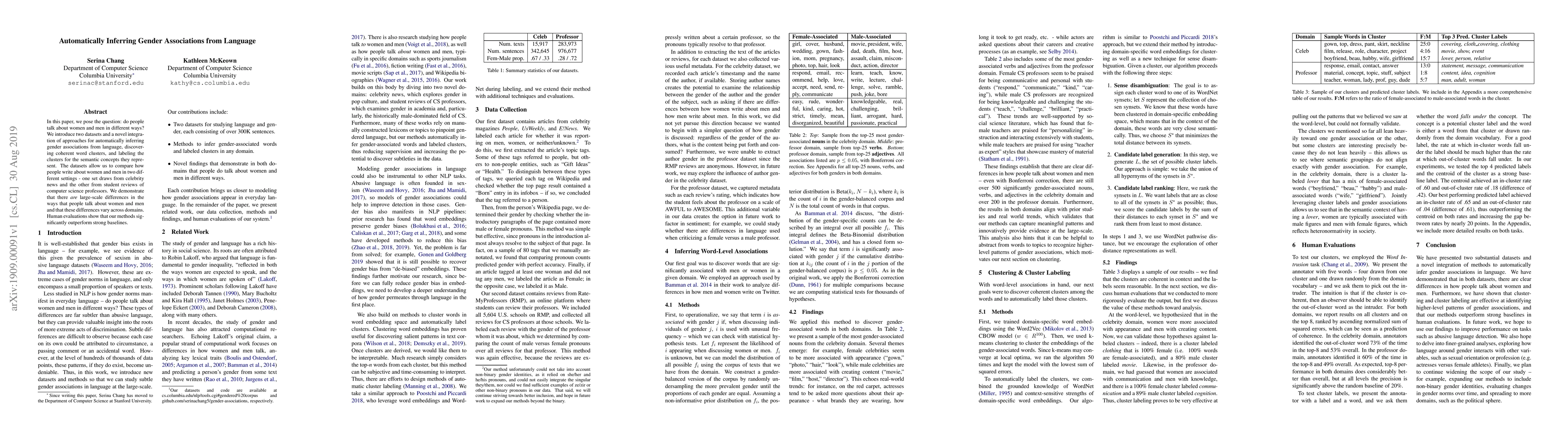 In this paper, we pose the question: do people talk about women and men in different ways? We introduce two datasets and a novel integration of approaches for automatically inferring gender associations from language, discovering coherent word clusters, and labeling the clusters for the semantic concepts they represent. The datasets allow us to compare how people write about women and men in two different settings - one set draws from celebrity news and the other from student reviews of computer science professors. We demonstrate that there are large-scale differences in the ways that people talk about women and men and that these differences vary across domains. Human evaluations show that our methods significantly outperform strong baselines.
