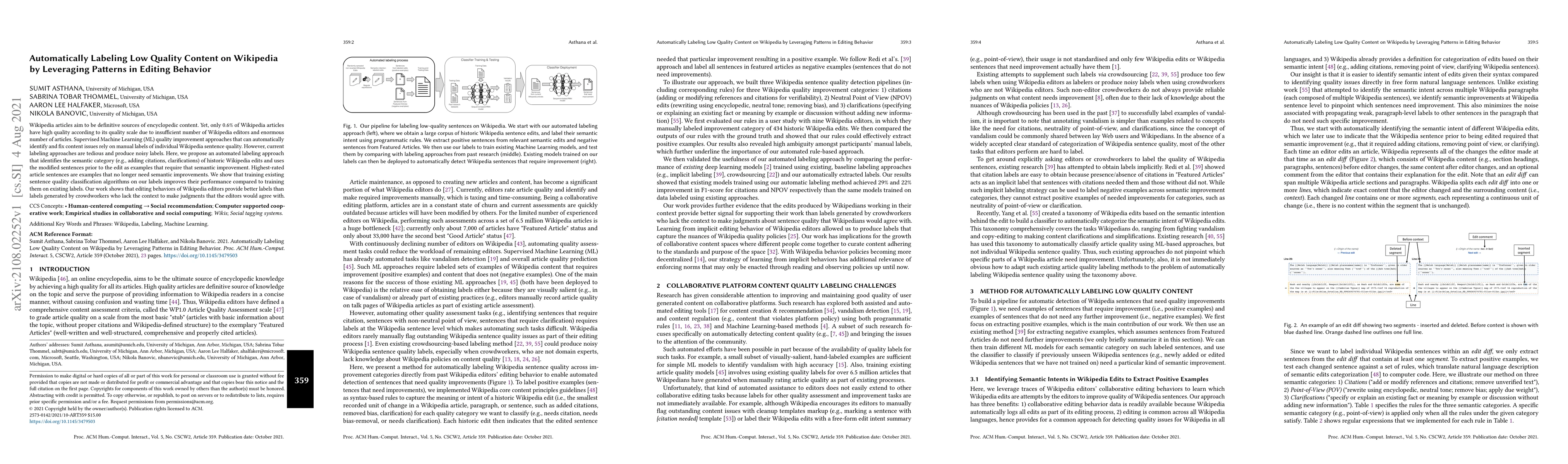 This paper proposes an automated method to label low-quality Wikipedia content by analyzing patterns in editing behaviors, showing that editor-driven labels improve the performance of machine learning models for quality classification compared to crowdsourced labels. The approach leverages historic edits to identify necessary semantic improvements, using high-quality sentences as non-improvement examples.