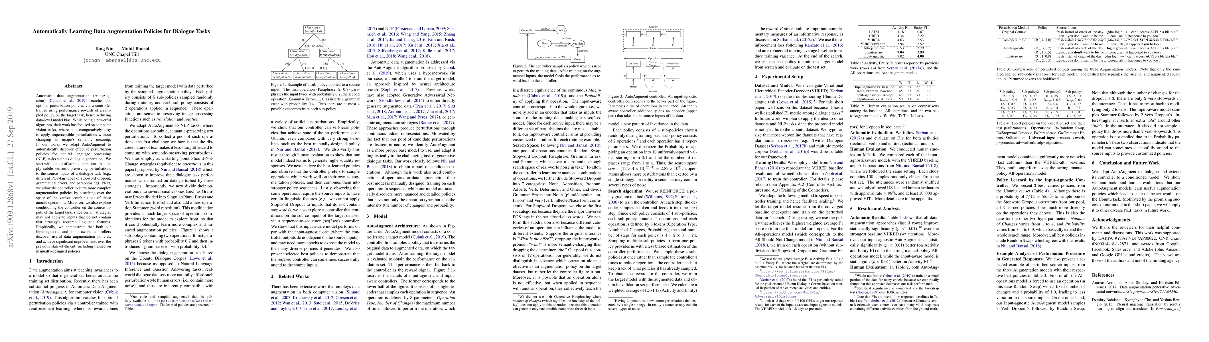 This paper adapts AutoAugment to develop automatic data augmentation policies for natural language processing tasks like dialogue generation, discovering effective perturbation strategies through a controller trained on task performance. The approach yields significant improvements over previous methods, both with input-agnostic and input-aware augmentation policies.