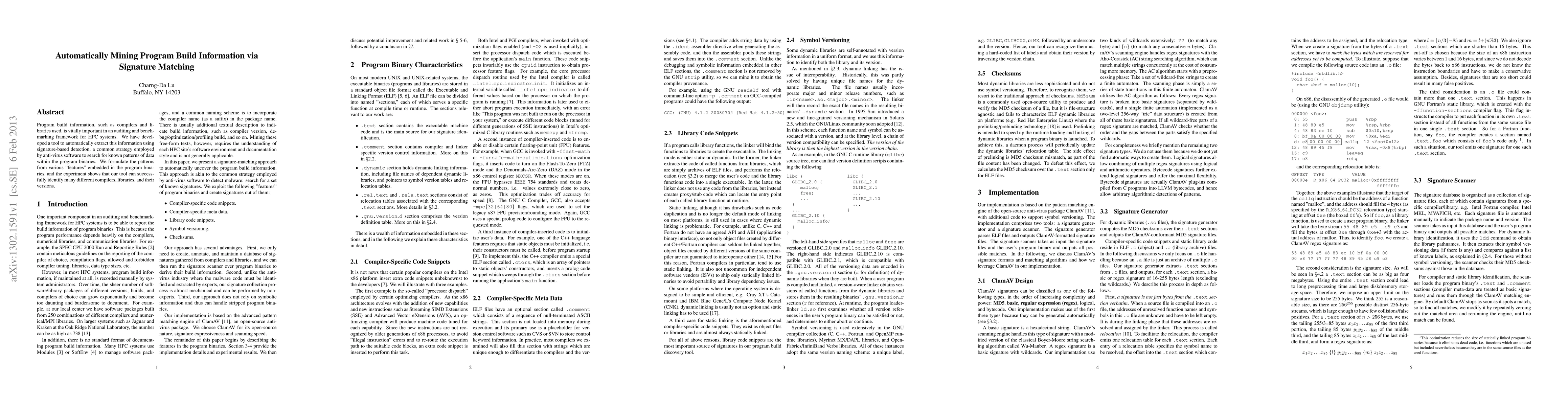 Program build information, such as compilers and libraries used, is vitally important in an auditing and benchmarking framework for HPC systems. We have developed a tool to automatically extract this information using signature-based detection, a common strategy employed by anti-virus software to search for known patterns of data within the program binaries. We formulate the patterns from various "features" embedded in the program binaries, and the experiment shows that our tool can successfully identify many different compilers, libraries, and their versions.