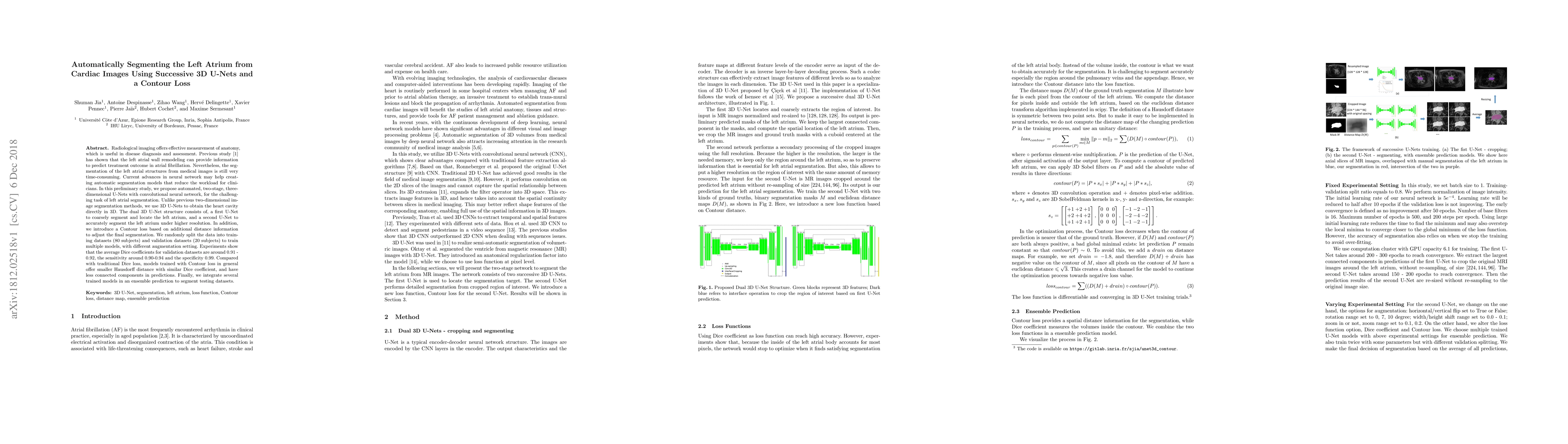 Radiological imaging offers effective measurement of anatomy, which is useful in disease diagnosis and assessment. Previous study has shown that the left atrial wall remodeling can provide information to predict treatment outcome in atrial fibrillation. Nevertheless, the segmentation of the left atrial structures from medical images is still very time-consuming. Current advances in neural network may help creating automatic segmentation models that reduce the workload for clinicians. In this preliminary study, we propose automated, two-stage, three-dimensional U-Nets with convolutional neural network, for the challenging task of left atrial segmentation. Unlike previous two-dimensional image segmentation methods, we use 3D U-Nets to obtain the heart cavity directly in 3D. The dual 3D U-Net structure consists of, a first U-Net to coarsely segment and locate the left atrium, and a second U-Net to accurately segment the left atrium under higher resolution. In addition, we introduce a Contour loss based on additional distance information to adjust the final segmentation. We randomly split the data into training datasets (80 subjects) and validation datasets (20 subjects) to train multiple models, with different augmentation setting. Experiments show that the average Dice coefficients for validation datasets are around 0.91 - 0.92, the sensitivity around 0.90-0.94 and the specificity 0.99. Compared with traditional Dice loss, models trained with Contour loss in general offer smaller Hausdorff distance with similar Dice coefficient, and have less connected components in predictions. Finally, we integrate several trained models in an ensemble prediction to segment testing datasets.
