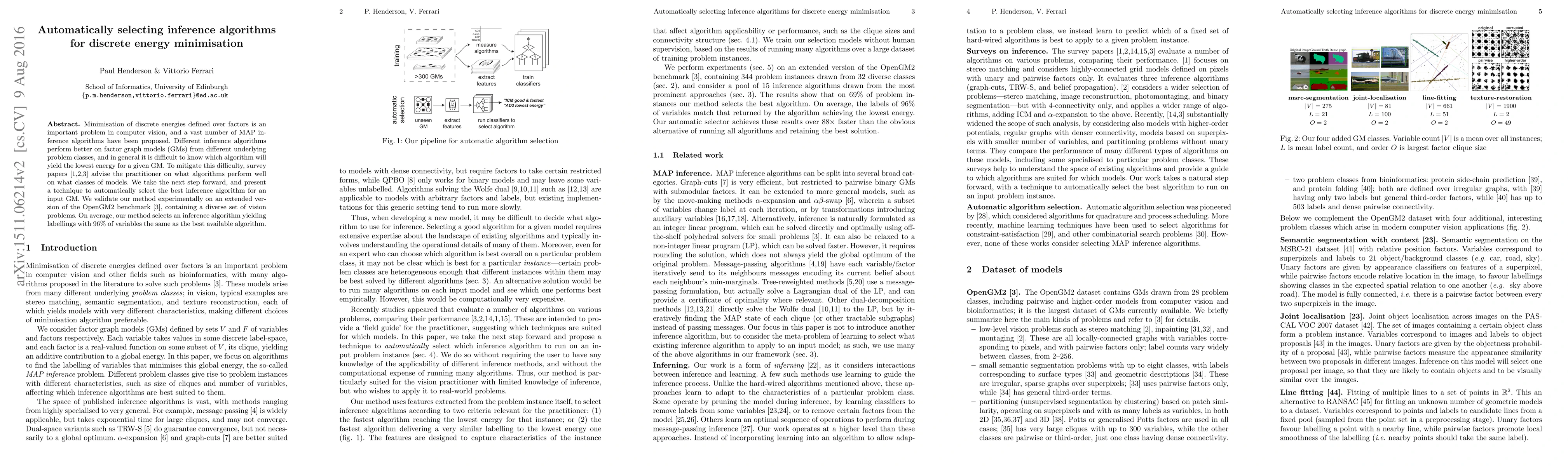 Minimisation of discrete energies defined over factors is an important problem in computer vision, and a vast number of MAP inference algorithms have been proposed. Different inference algorithms perform better on factor graph models (GMs) from different underlying problem classes, and in general it is difficult to know which algorithm will yield the lowest energy for a given GM. To mitigate this difficulty, survey papers advise the practitioner on what algorithms perform well on what classes of models. We take the next step forward, and present a technique to automatically select the best inference algorithm for an input GM. We validate our method experimentally on an extended version of the OpenGM2 benchmark, containing a diverse set of vision problems. On average, our method selects an inference algorithm yielding labellings with 96% of variables the same as the best available algorithm.