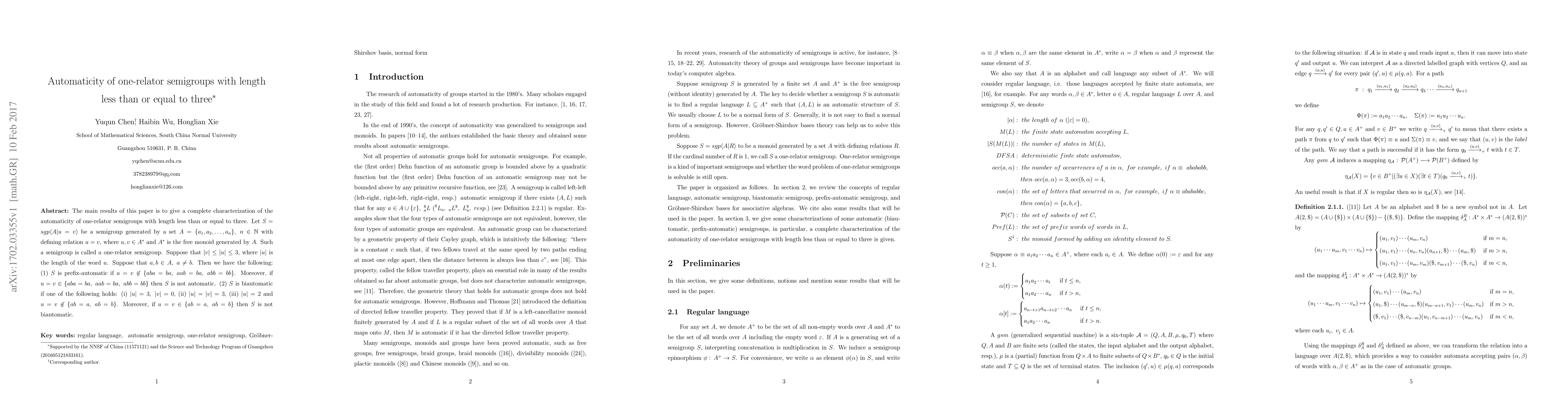 This paper characterizes the automaticity of one-relator semigroups with length less than or equal to three, revealing conditions under which they are prefix-automatic or biautomatic.