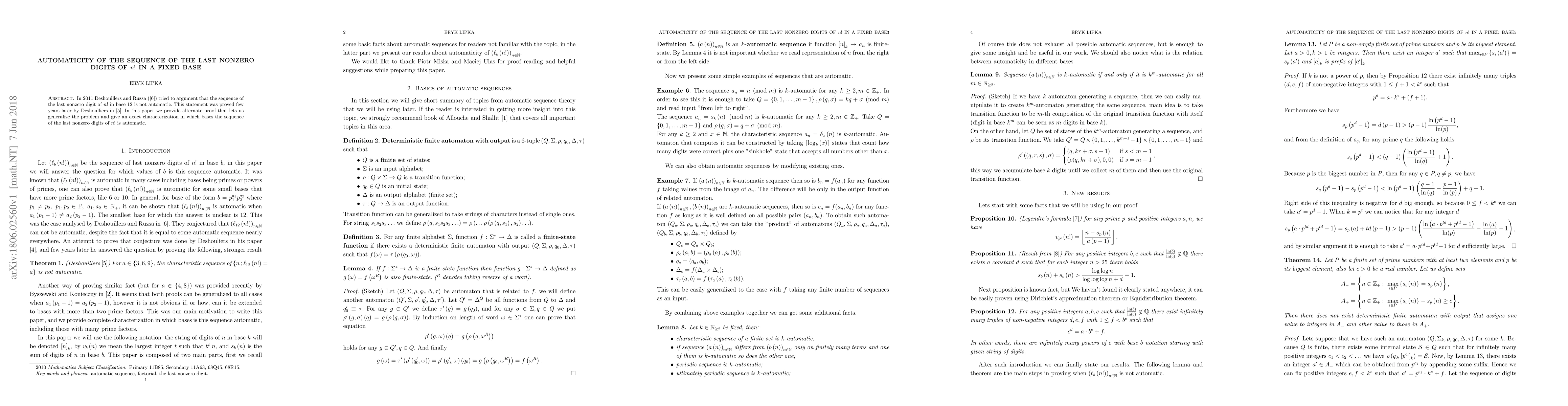 This paper provides an alternate proof that generalizes the sequence of last nonzero digits of n! in base 12 being automatic to any base, giving an exact characterization for automaticity.